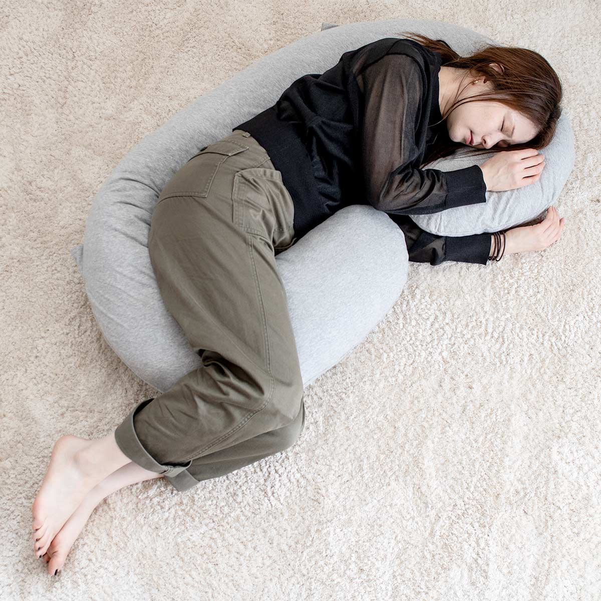 C型で長めの作りなので、妊娠中でもリラックスして睡眠がとれる横向きの寝姿勢(シムスの体位)をラクにキープできます。背中や腰がサポートされるので、優しく包み込まれているような安心感で眠ることができます。妊娠中だけでなく、快適な横向き寝がしたいすべての方におすすめの抱き枕です。
