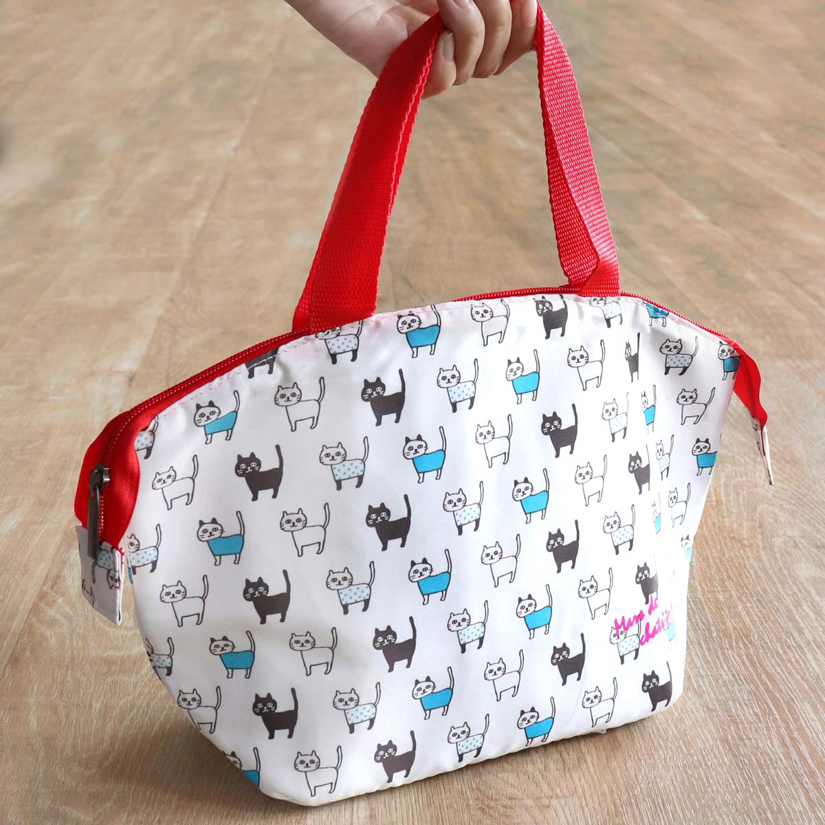 全面に猫が描かれた可愛いランチバッグです。トートタイプなので持ち運びしやすく、毎日の通学や通勤に便利です。ちょっとしたお買い物の際に使うエコバッグとしてもお使いいただけます。