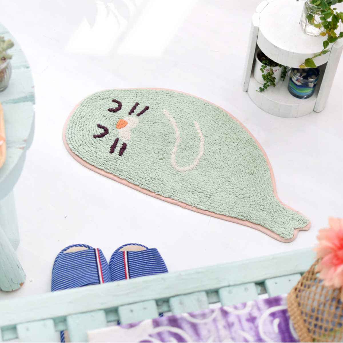 ゆったり泳いでいる様な海のなかまたちが可愛いマットです。一枚敷くだけでお部屋のワンポイントになるデザインです。