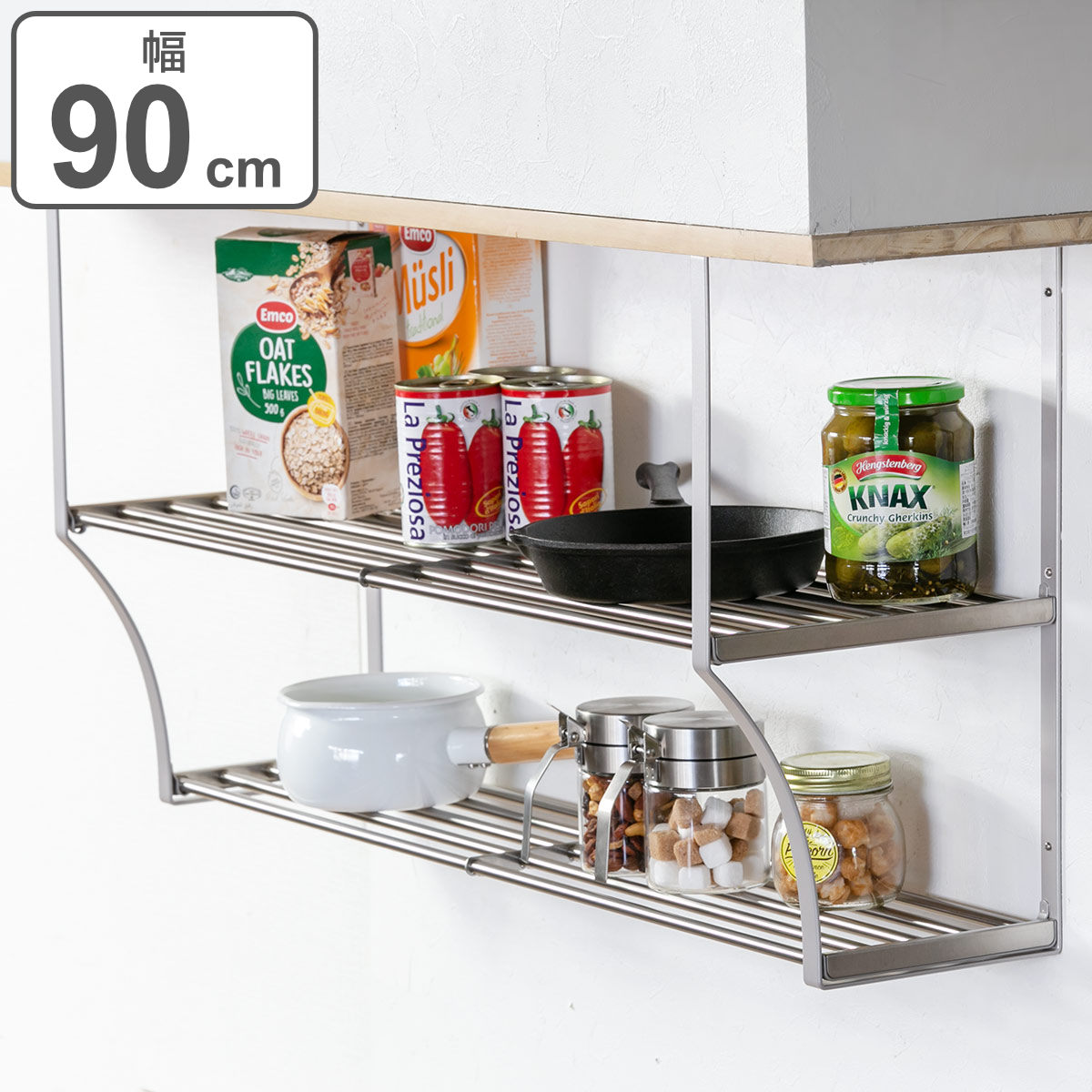 吊戸棚下の空間を有効活用 ネジ止めパイプ棚2段 幅90cmキッチンの吊戸棚下の空いているスペースに設置できる「ネジ止めタイプの水切り棚」です。丈夫でサビに強いステンレス製のパイプ棚で、縦の空間を上手に使えます。シンク上に設置すれば、スノコ状の棚が風通しがよく、洗い物を早く乾かすことができます。調理台上の空間に設置すれば、グラスや鍋・フライパン、調味料などの収納スペースとしてもお使いいただけます。