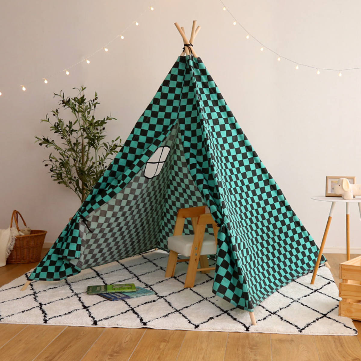 キッズテント 幅140cm 桐天然木 市松柄 ( ティピー テント 子供用 おうちテント 室内 )