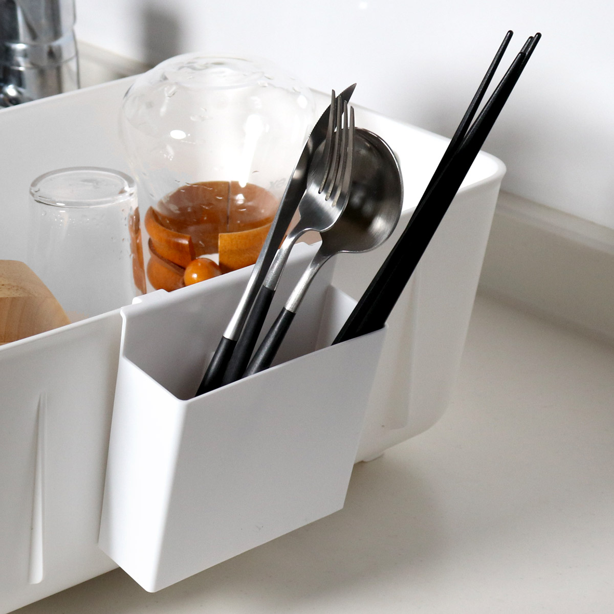 箸やスプーン&フォークなどの水切りや収納にピッタリなスリムポケットロングです。フックで引っ掛けるだけの簡単取り付けで、水切りカゴに取り付けてお使いいただけます。面倒な洗い物がテキパキと片付く機能性と美しいカタチが日々の家事を楽にしてくれます。