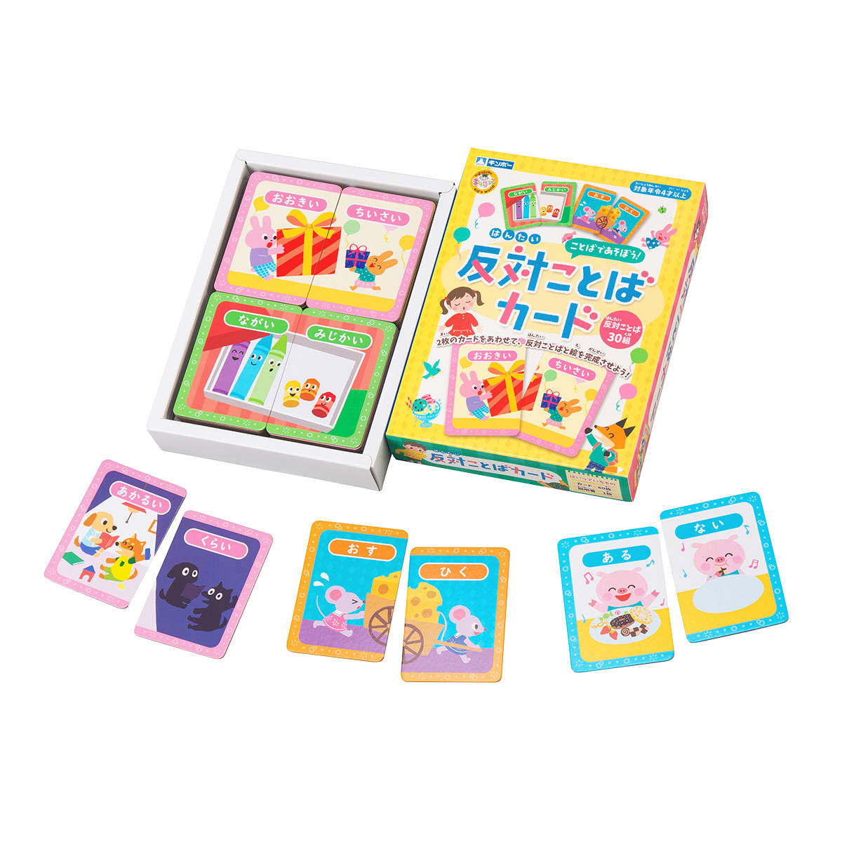 ことばで遊ぼう、反対ことばカード2枚のカードを合わせて絵と文字を完成させましょう。生活の中で頻繁に使うことばやその反対語を、イラストと対比しながら学ぶことができます。