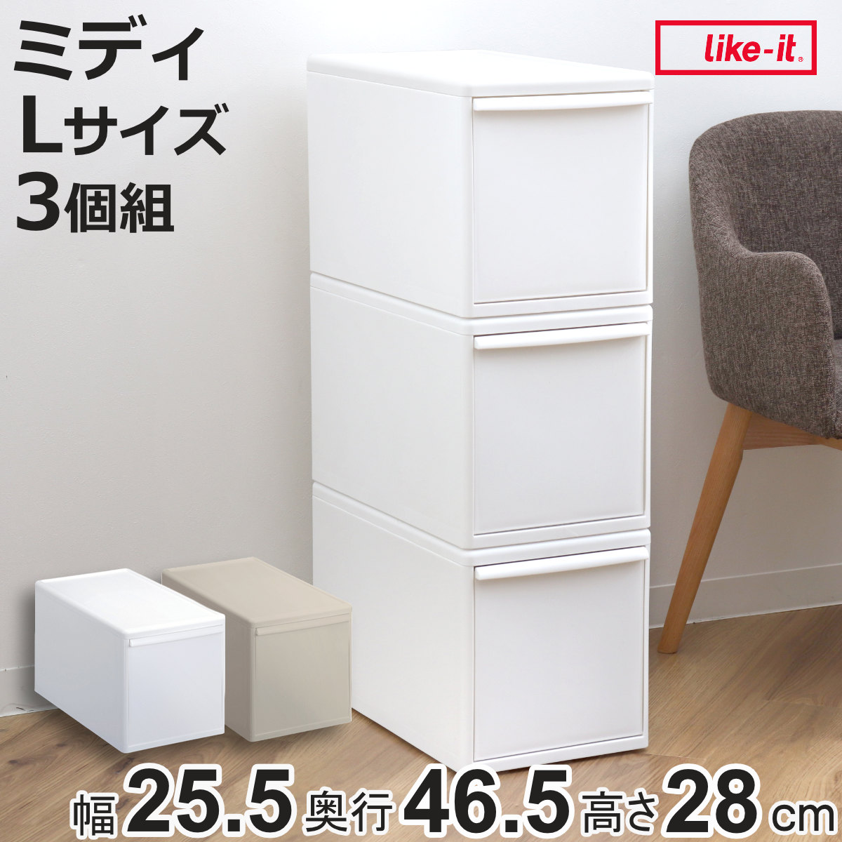 | サイズ | 約 幅25.5×奥行46.5×高さ28(cm) 引き出し内寸:約 幅21.3×奥行43.1×高さ22.5(cm) |