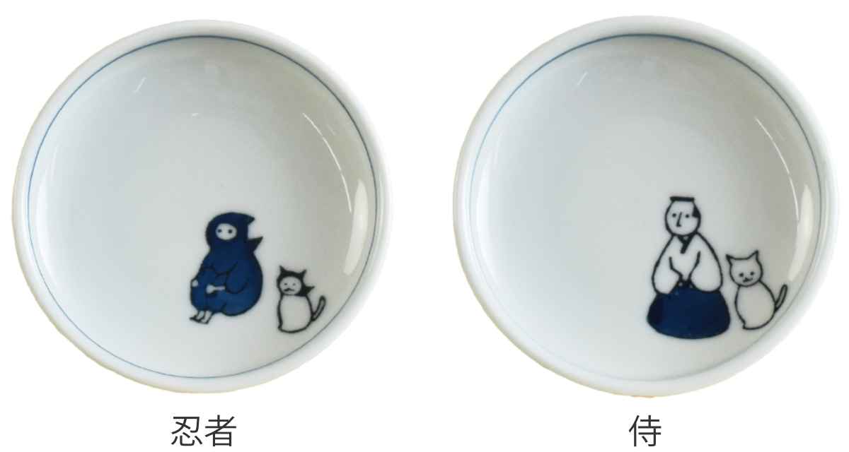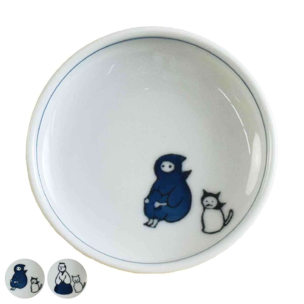 ゆるい感じのイラストが魅力の小皿10.5cm様々なキャラクターがのんびり過ごすホッと一息つきたい時間にピッタリのシリーズです。イラストはお侍さんや忍者が寝転んでいたり、猫と佇んでいる姿等々、休日を連想させるものばかりです。薬味や調味料を入れるのに適したサイズです。