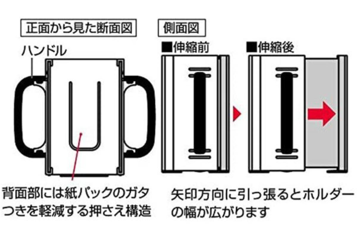 幅広い容量の紙パックに対応50×47〜71mm以下の幅広い紙パックサイズに対応するスライド式の伸縮構造になっています。※小さいサイズの紙パックをセットされた際は、空間部分が多くなり、動きやすくなるのでご注意下さい。