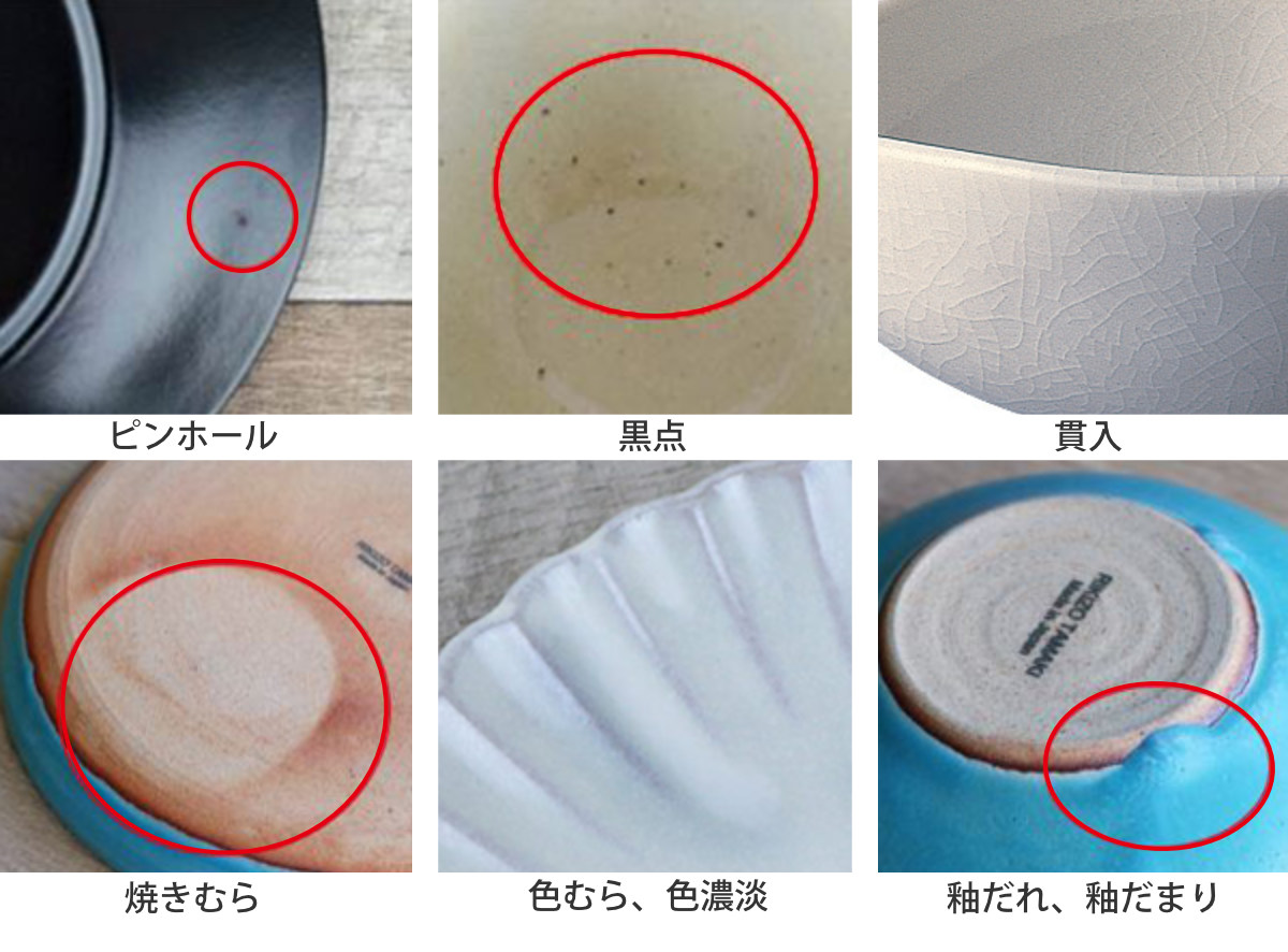 陶器・磁器商品の特性について原料や製造方法により、上記のような特性がみられる場合があります。ひとつひとつのうつわの持つ個性、温かみある風合いとしてお楽しみいただければ幸いです。