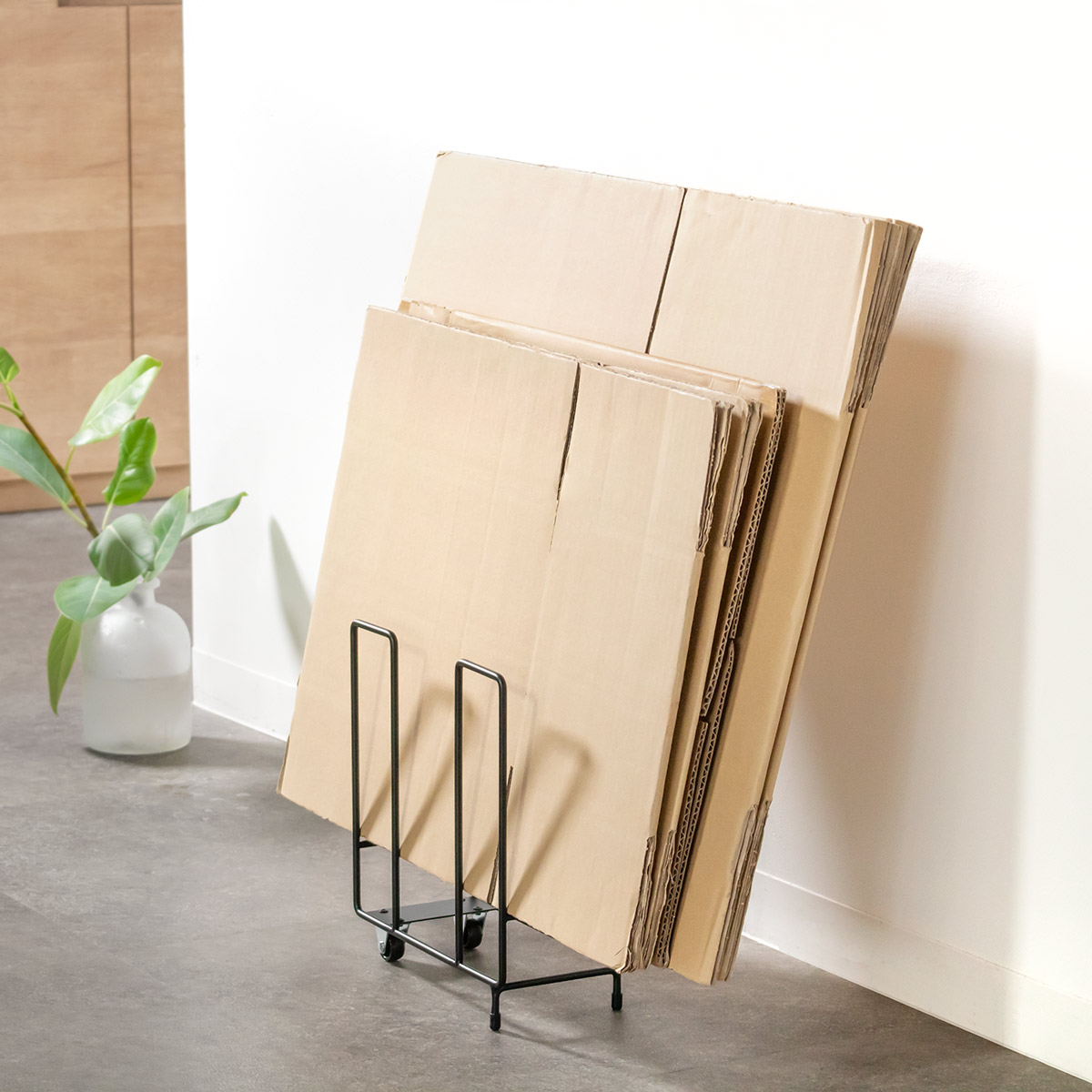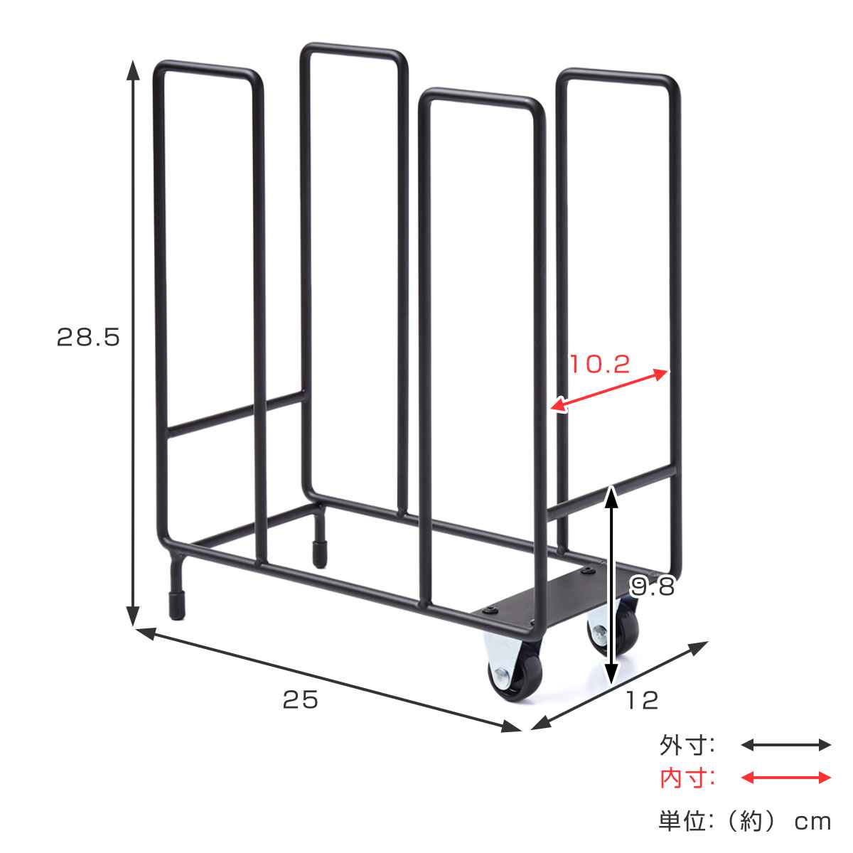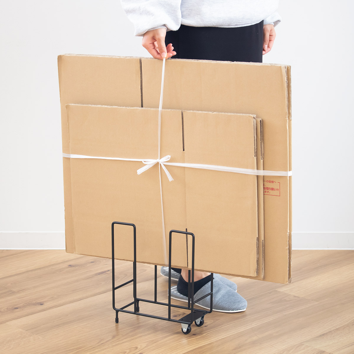 ダンボール収納 収納ラック ストッカー 省スペース シンプル ブラック キャスター付き スチール 紙袋 片付け すっきり スッキリ 紐 縛りやすい 約8枚 便利グッズ キッチン 玄関 段ボールストッカー 段ボール置き ダンボール置き 入れ おしゃれ お洒落 オシャレ 分別 収集 保管 段ボール立て 整理整頓 整頓 スッキリ収納 便利 収納したまま 結束 黒 幅12×奥行25×高さ28.5cm 幅12