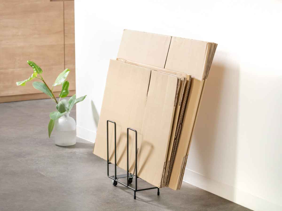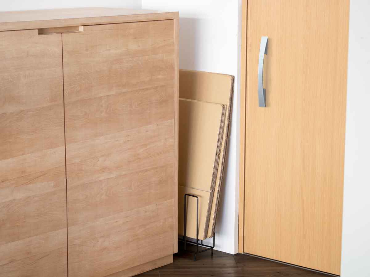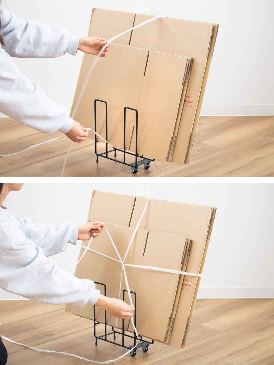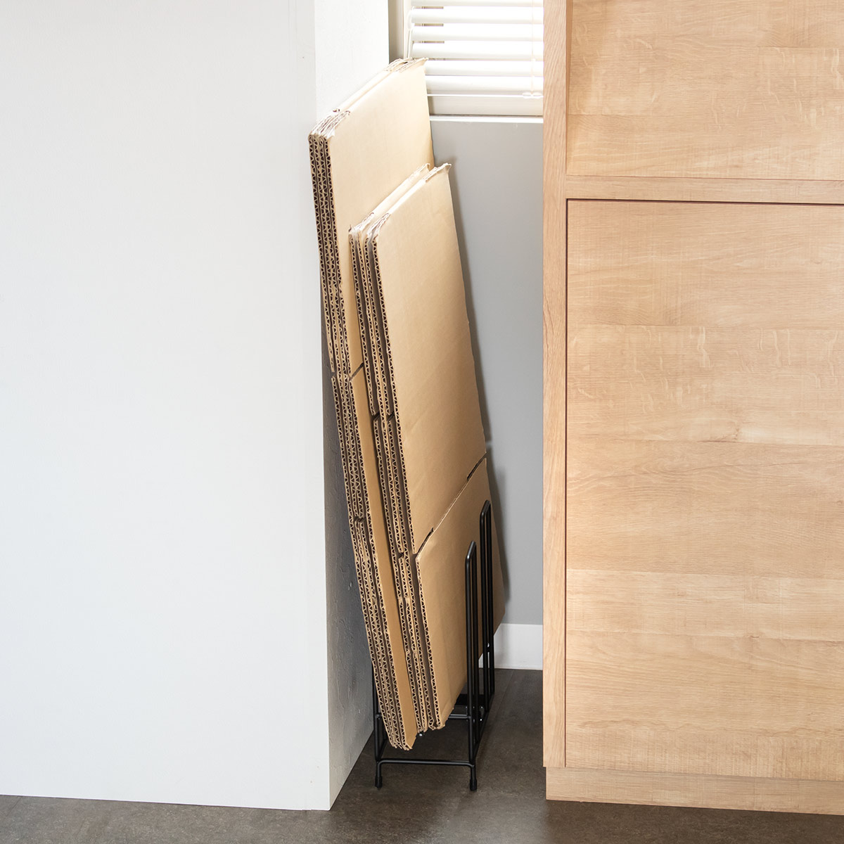 かさばるダンボールをスッキリと収納できるダンボールストッカーです。大きさの違うダンボールでもバラバラにならず収納することができるので、見た目もスッキリと収まります。