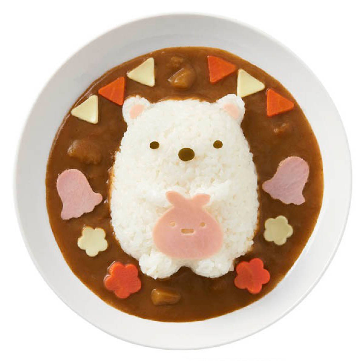 キャラクターのデコカレーがおうちで簡単に作れるごはん型●すみっコぐらしの立体的なご飯型と抜き型でかわいく楽しい食卓を演出できるデコカレーです。