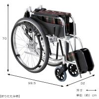 | サイズ | 約 幅70×奥行99.5×高さ87.5(cm) 折りたたみ時:約 幅32×奥行99.5×高さ70(cm) 前座高:43(cm)、後座高:41(cm) 座面幅:46(cm) 座面奥行:40(cm) バックサポート高:42(cm) アームサポート高:22.5(cm) ティッピングレバー径:22.2(mm) 前輪:6インチ、後輪22インチ |