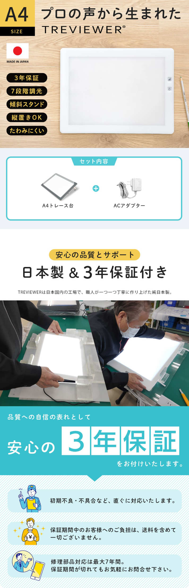 | 備考 | ※メーカー3年保証付 透写範囲:約 幅21×奥行29.7 (cm) 適応用紙:A4判 光源:LED色温度6500〜7000ケルビン 光源寿命:約40000時間 中央部の明るさ:2400〜4700ルクス 調光機能:7段階(タッチセンサー式) 傾斜角度:4度/13度/17度 |