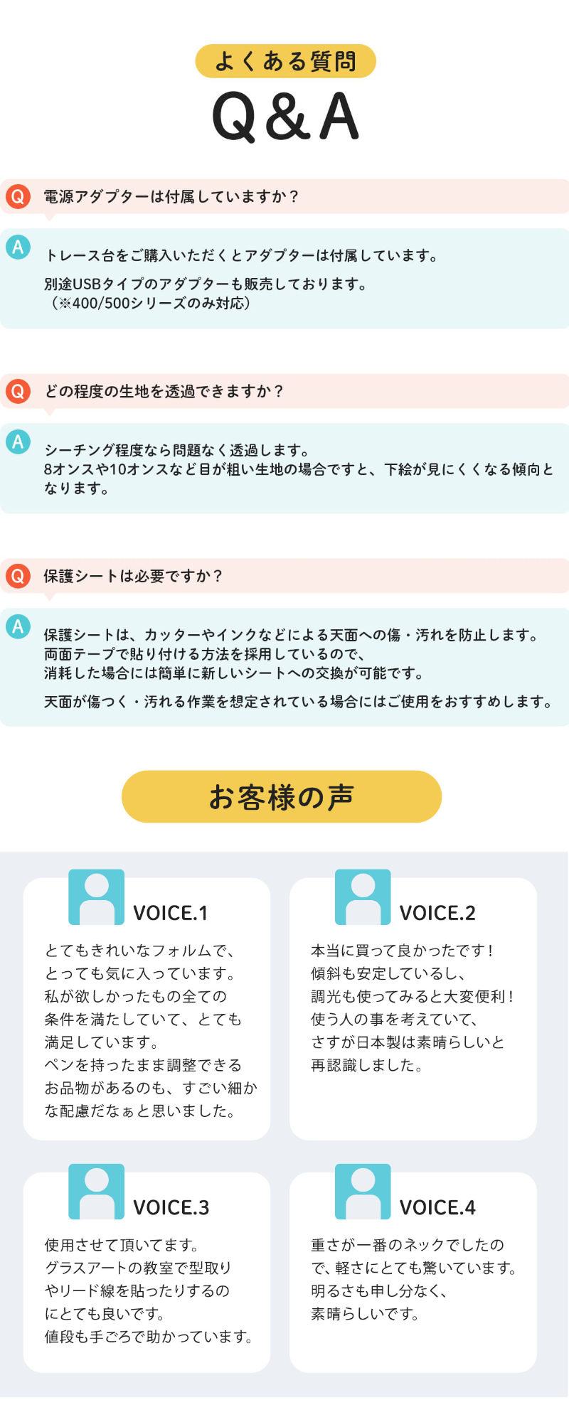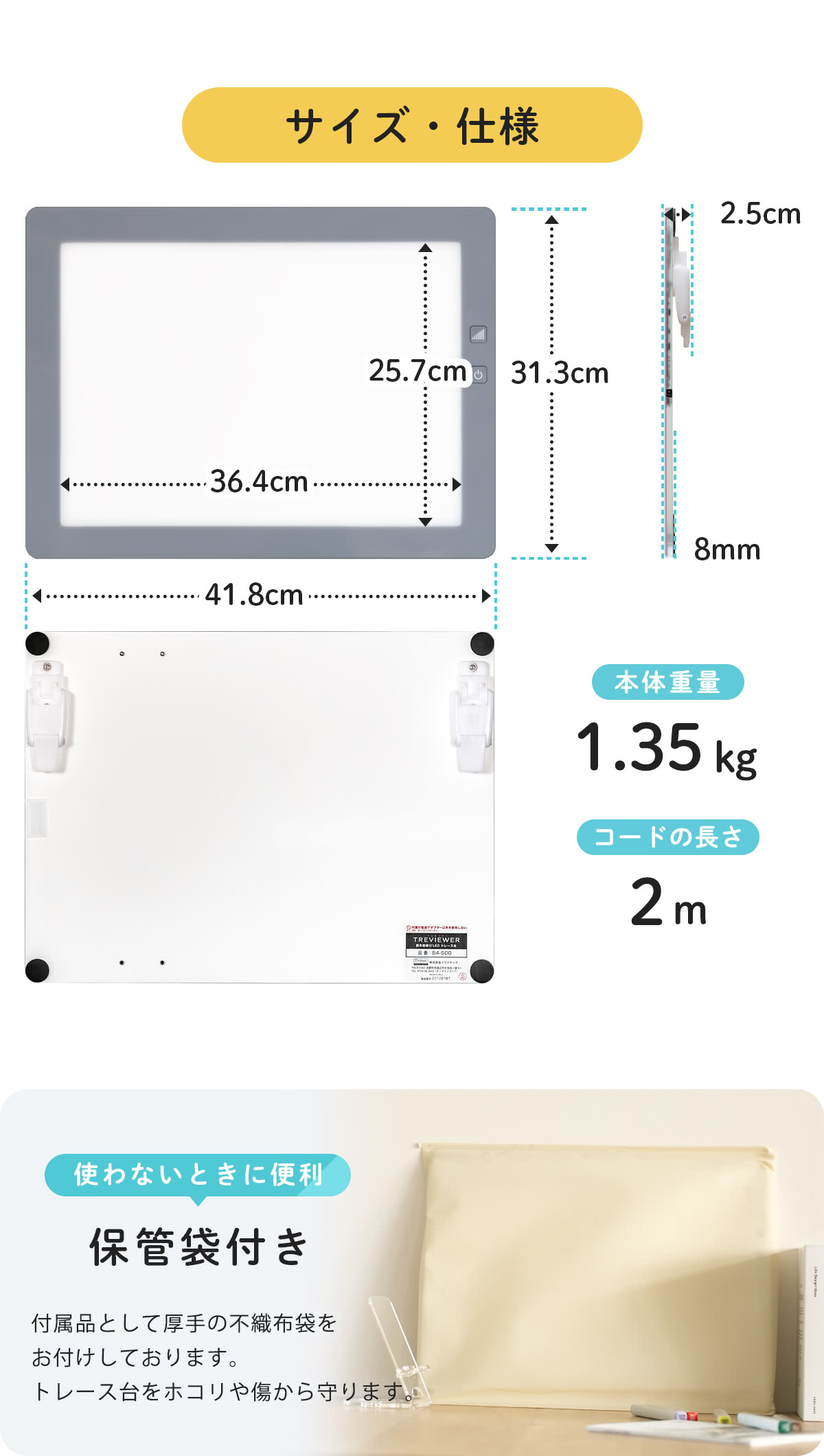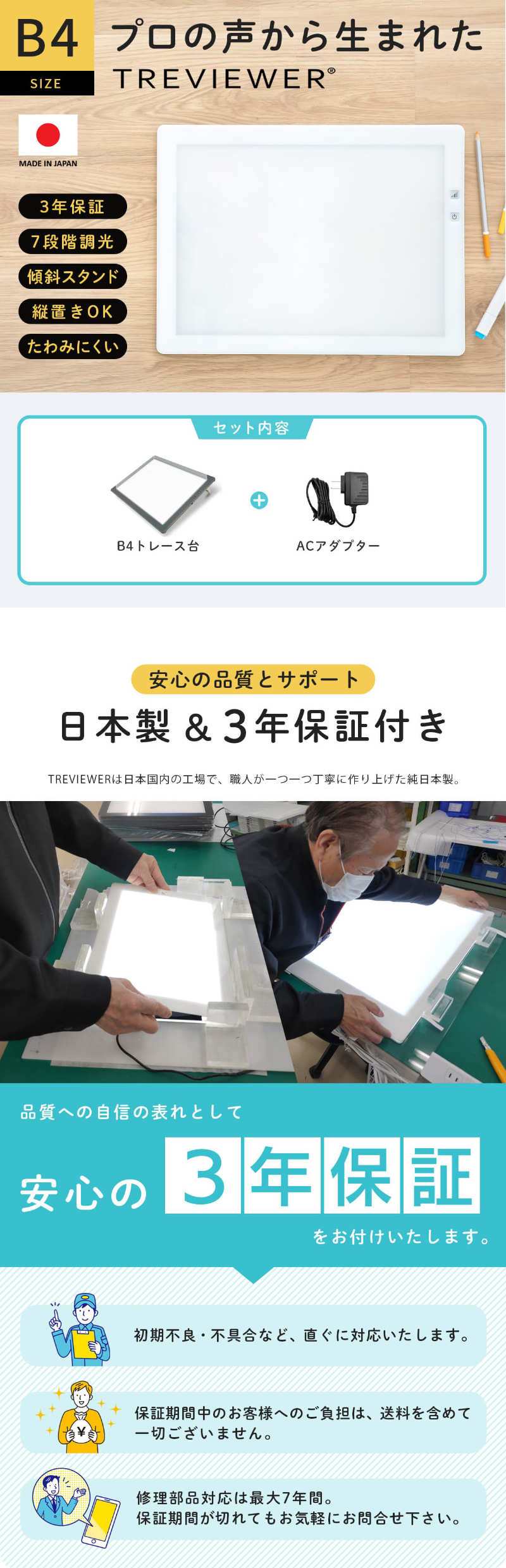 | 備考 | ※メーカー3年保証付 透写範囲:約 幅25.7×奥行36.4 (cm) 適応用紙:B4判 光源:LED色温度6500〜7000ケルビン 光源寿命:約40000時間 中央部の明るさ:2500〜4800ルクス 調光機能:7段階(タッチセンサー式) 傾斜角度:4度/11度/14度 |