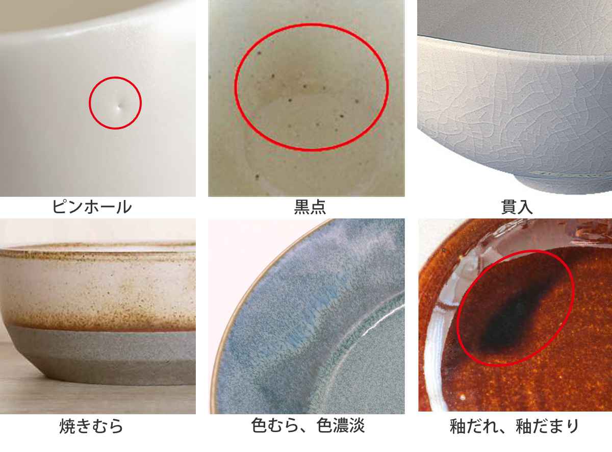 陶器・磁器商品の特性について原料や製造方法により、上記のような特性がみられる場合があります。ひとつひとつのうつわの持つ個性、温かみある風合いとしてお楽しみいただければ幸いです。