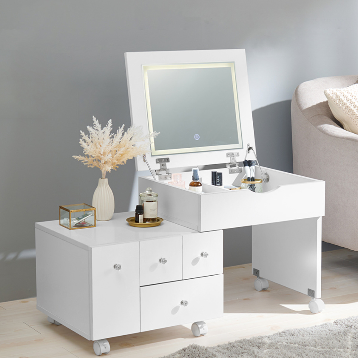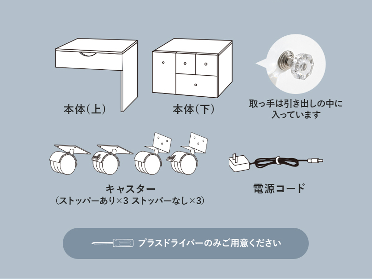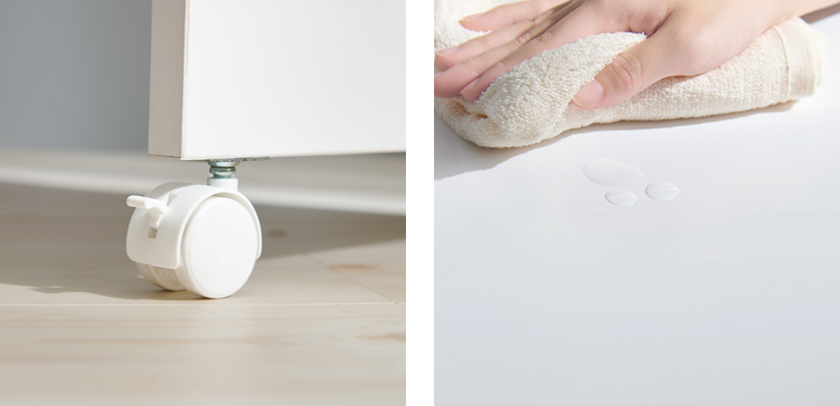 | ストッパー付きキャスター 移動がラクにできるキャスター付きです。ストッパーが付いているので固定もできて安心です。 | お手入れ簡単 水や汚れに強いメラミン加工が施されています。サッと拭くだけでお手入れ簡単です。 |