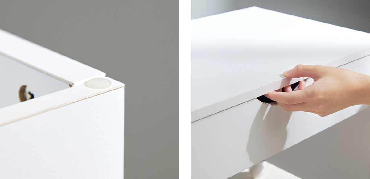 | クッションシール付き 天板を閉じるときの音や傷を防止するクッションシールが付いています。 | 手を挟みにくい天板 天板下に窪みがあるため、天板を閉じたときに手を挟みにくい仕様です。 |