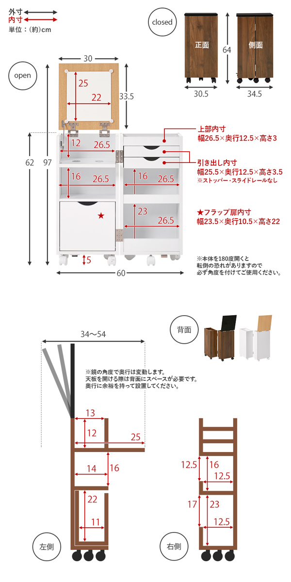 | サイズ | 収納時:約 幅30.5×奥行34.5×高さ64(cm) 展開時:約 幅62×奥行67.5×高さ97(cm) |
