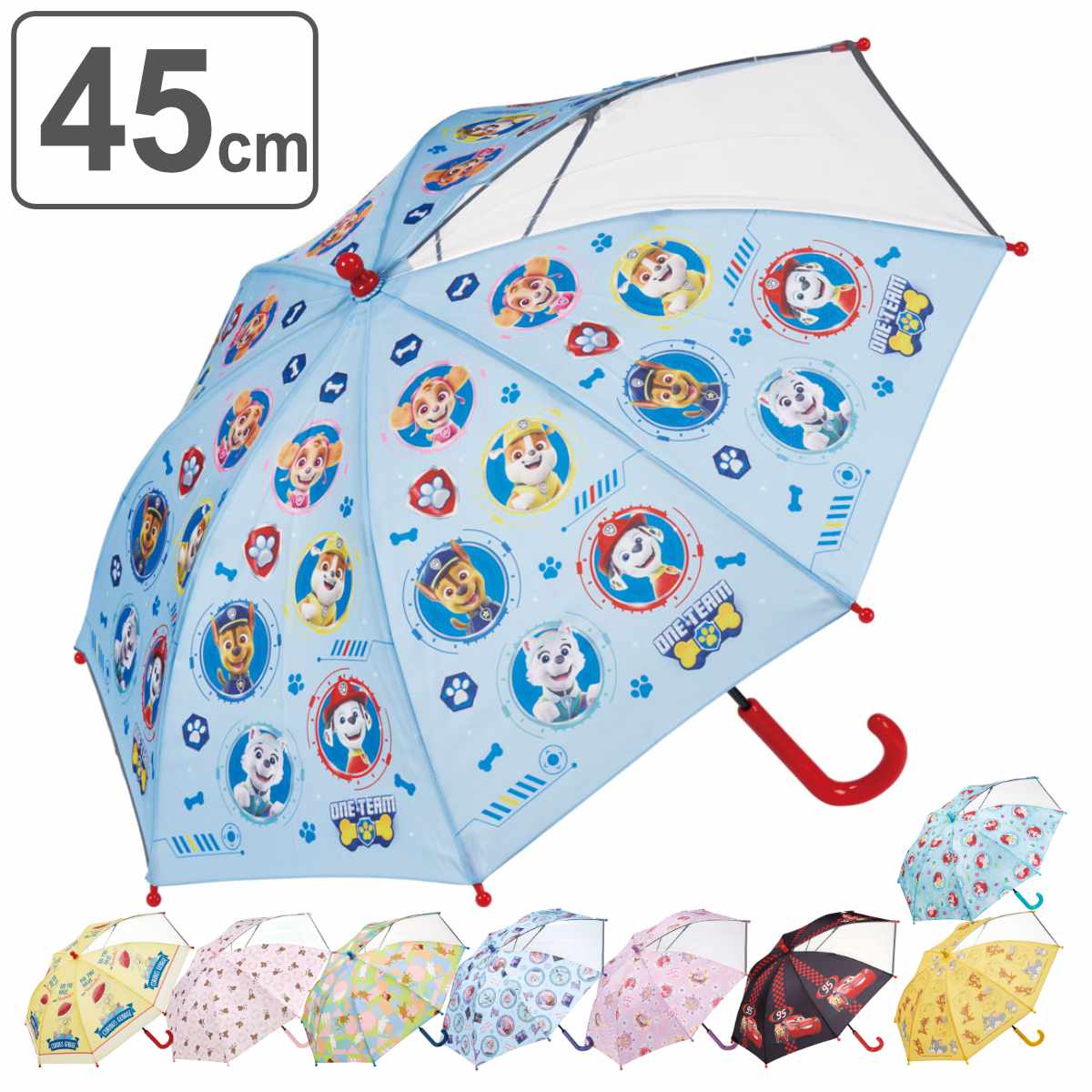 45cm子供用手開き傘キャラクターの子ども用傘です。雨の日もお気に入りのキャラクターと一緒に楽しくお出かけができます。サイズは45cm(傘骨の長さ)、適応身長の目安は105cm〜125cmです。※傘骨とは傘を開いた時に中央から外まで伸びるそれぞれの骨のことです。