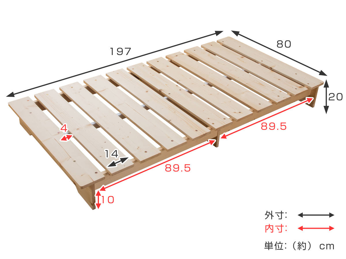 ベッドの高さは20cm、すのこの隙間は4cmと狭いので、布団でもマットレスでも快適にお使いいただけます。