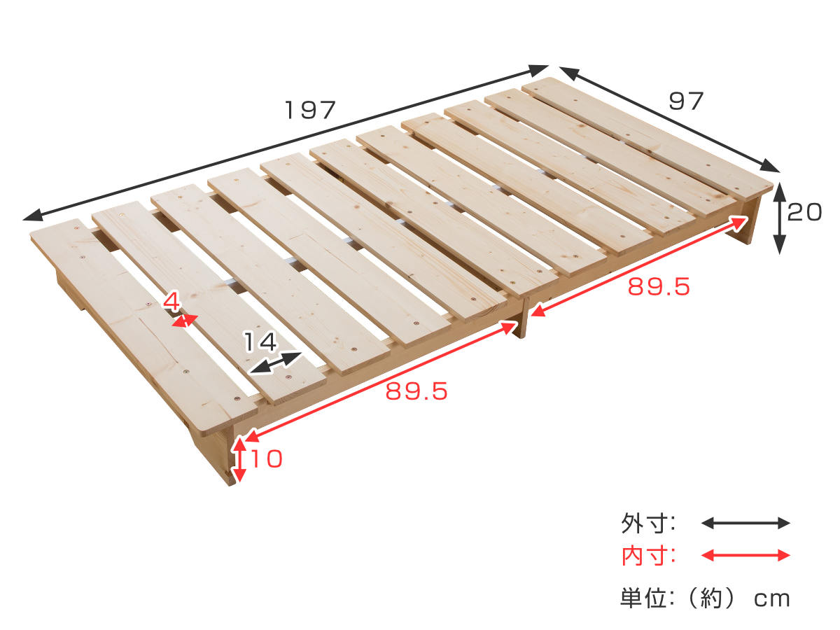 ベッドの高さは20cm、すのこの隙間は4cmと狭いので、布団でもマットレスでも快適にお使いいただけます。