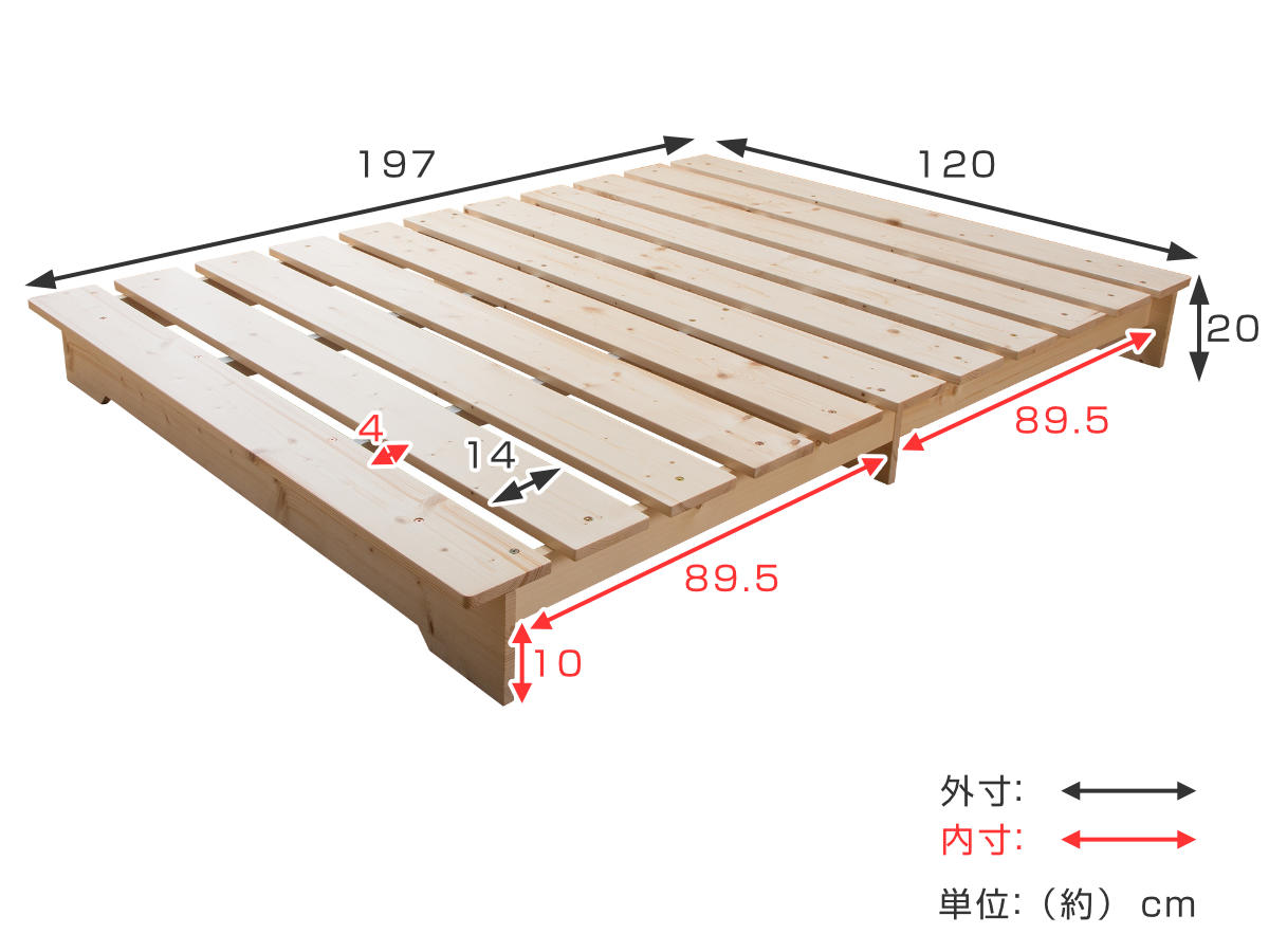 ベッドの高さは20cm、すのこの隙間は4cmと狭いので、布団でもマットレスでも快適にお使いいただけます。