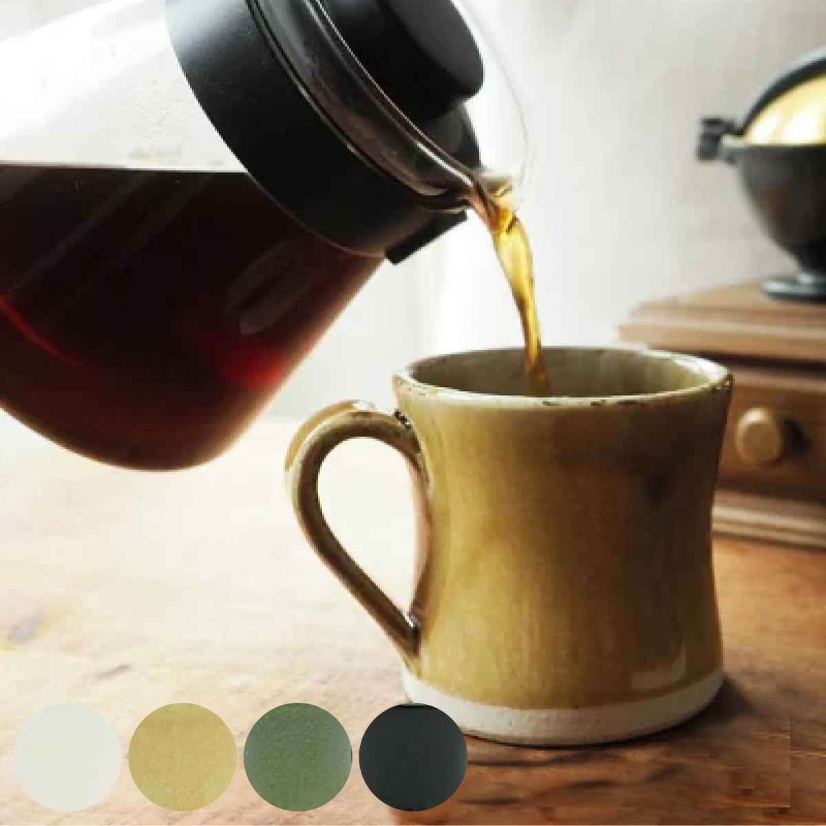 腰にくびれのある独特な形状のマグカップ 300mlどしっと安定感のある形状のマグカップです。見た目に反して軽いので女性でも持ちやすいです。一つひとつ手練りで作られている取っ手は、少し厚みがありギュッと握りやすくなっていて、普段使いしやすいアイテムです。