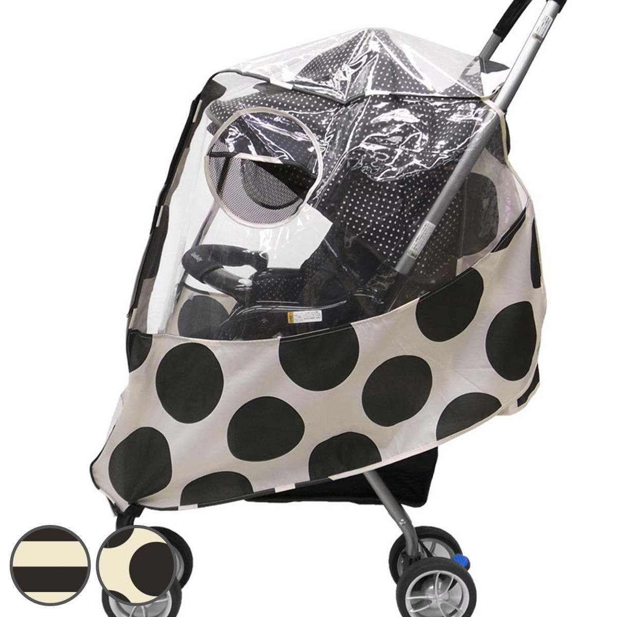 雨、風、花粉などから大切なお子様を優しくガード大切なお子様を雨、風、花粉、ホコリなどから守るベビーカーカバーです。大きなドットやボーダー柄がお洒落で目を惹くデザインです。夏以外の3シーズンでお使いいただけます。