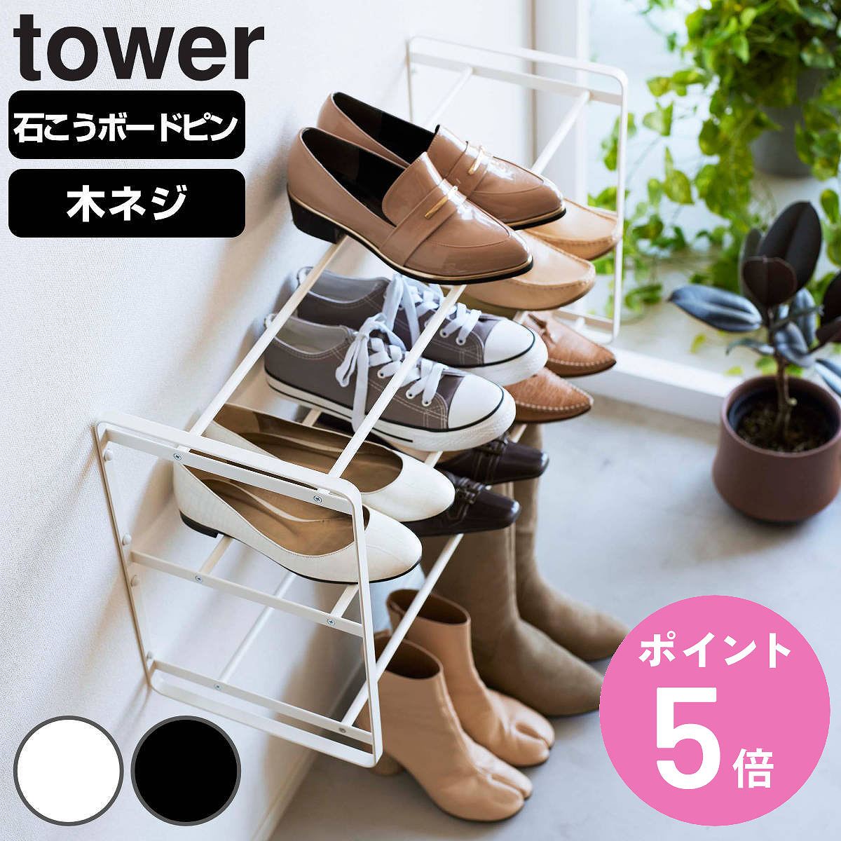石こうボードピンで壁に簡単取り付け石こうボードピンや木ネジで壁に取り付けられるシューズラックです。ちらかりがちな玄関の靴やスリッパをサッと収納でき、玄関が毎日スッキリと片付きます。壁を活用できるので狭い玄関でも場所をとらず省スペースです。スチール製×シンプルデザインで、どんなインテリアにも馴染みます。