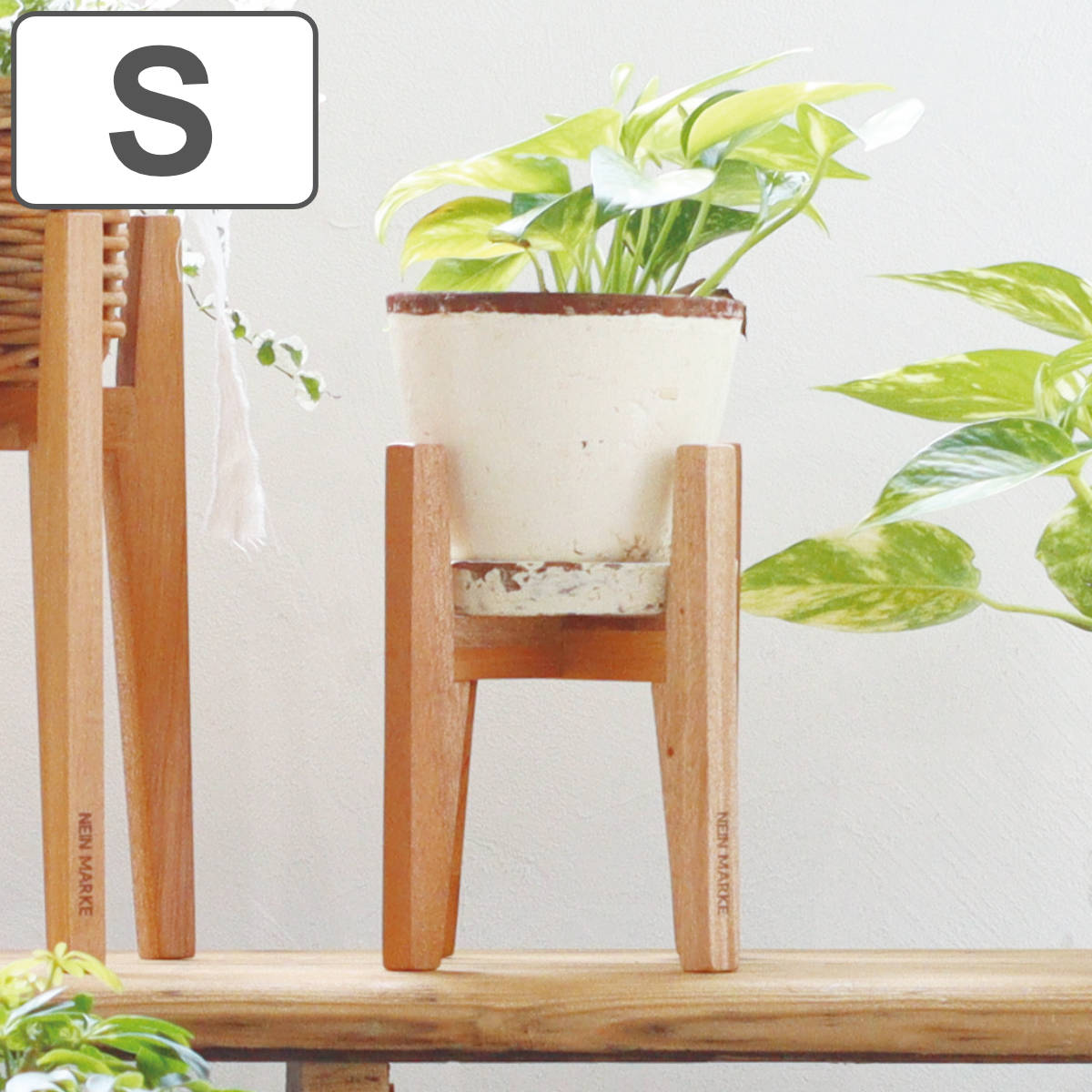 マホガニーを贅沢に使用した、「ナインマーケ」シリーズの木の温もり溢れるポットスタンドです。Sサイズはコンパクトで、ちょっとしたスペースにも飾りやすいサイズです。約直径12cmの鉢までに対応しています。