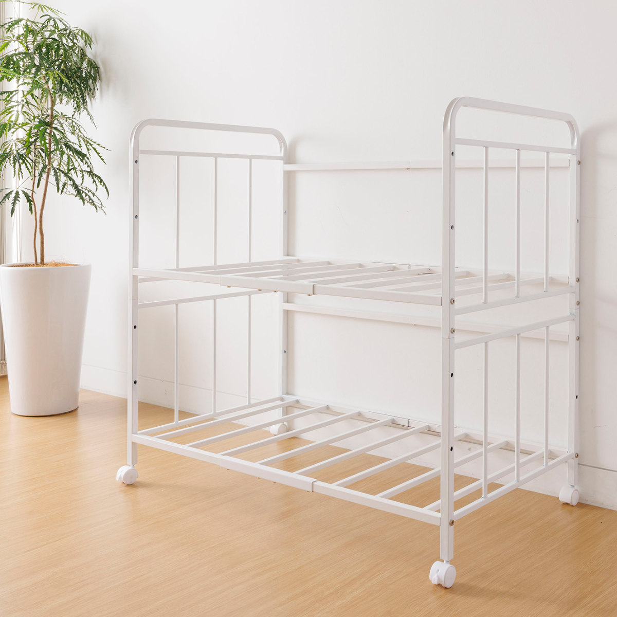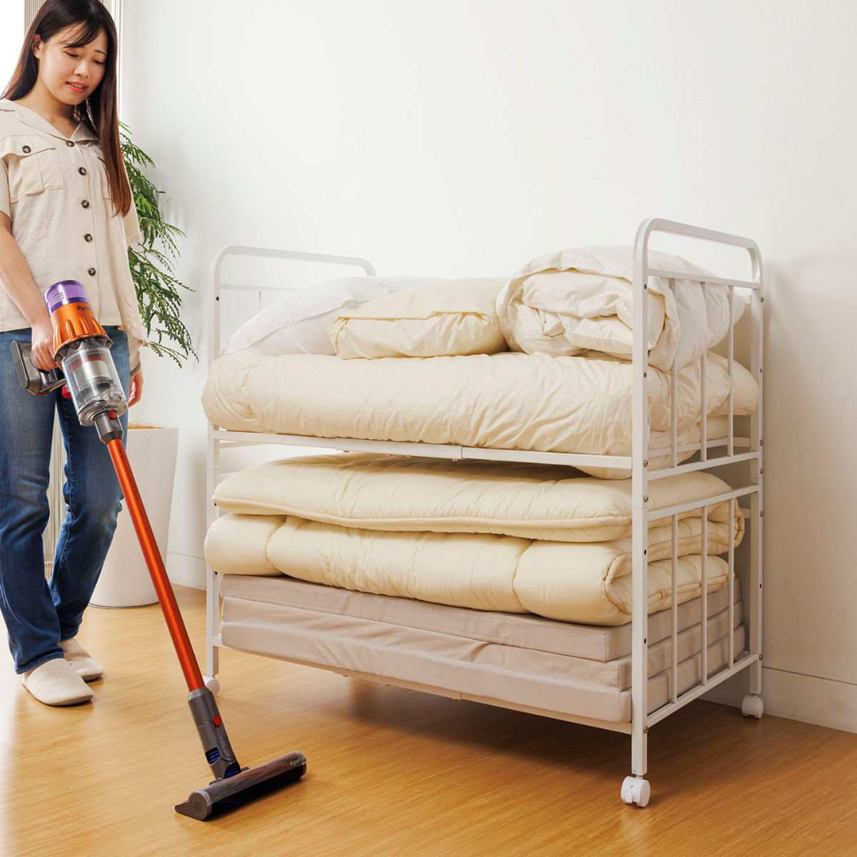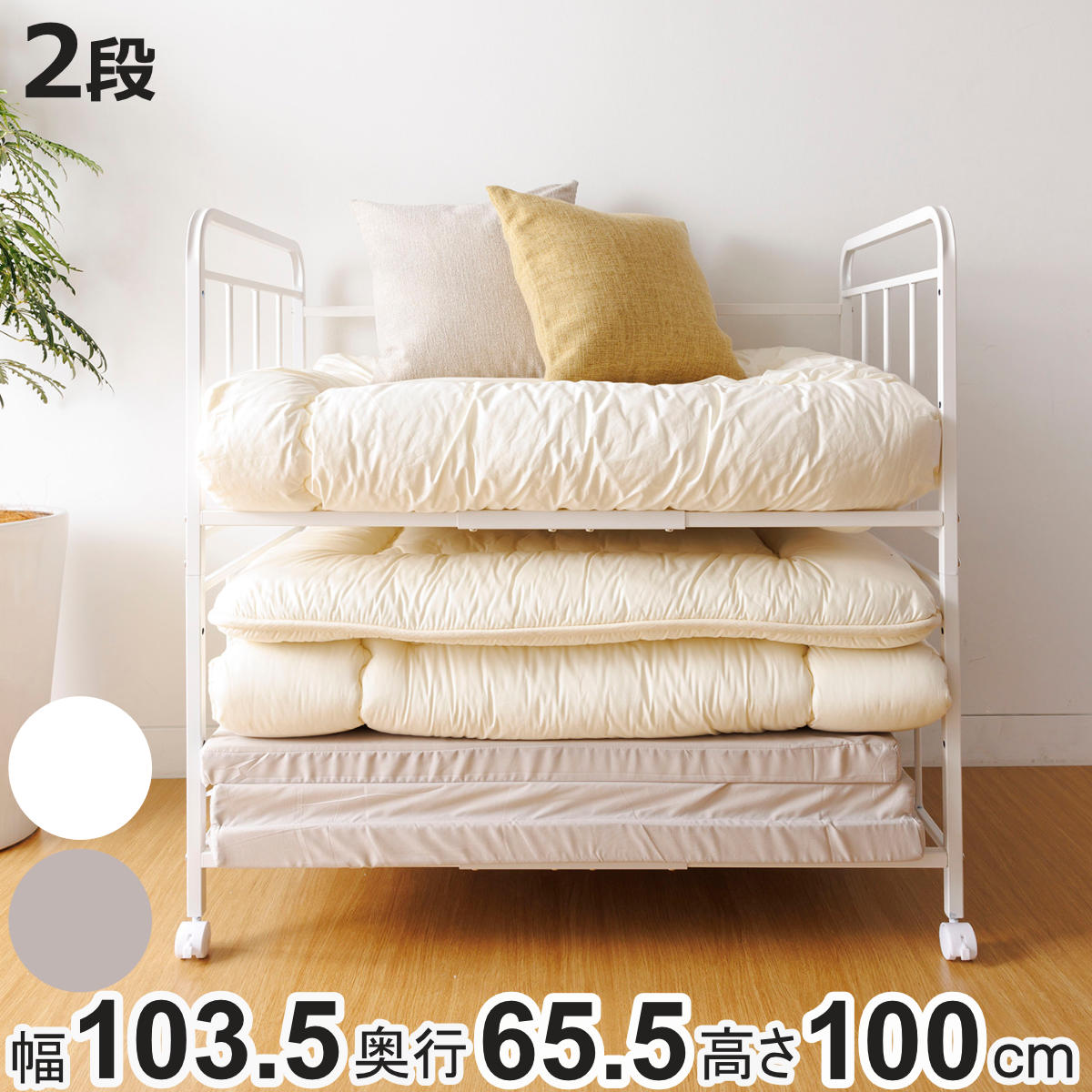 布団収納ラック2段 幅103.5奥行65.5高さ100cm キャスター付き ( 布団 収納 ラック ワゴン ふとん シングル 掛け布団 敷き布団 マットレス 通気性 高さ調節 )