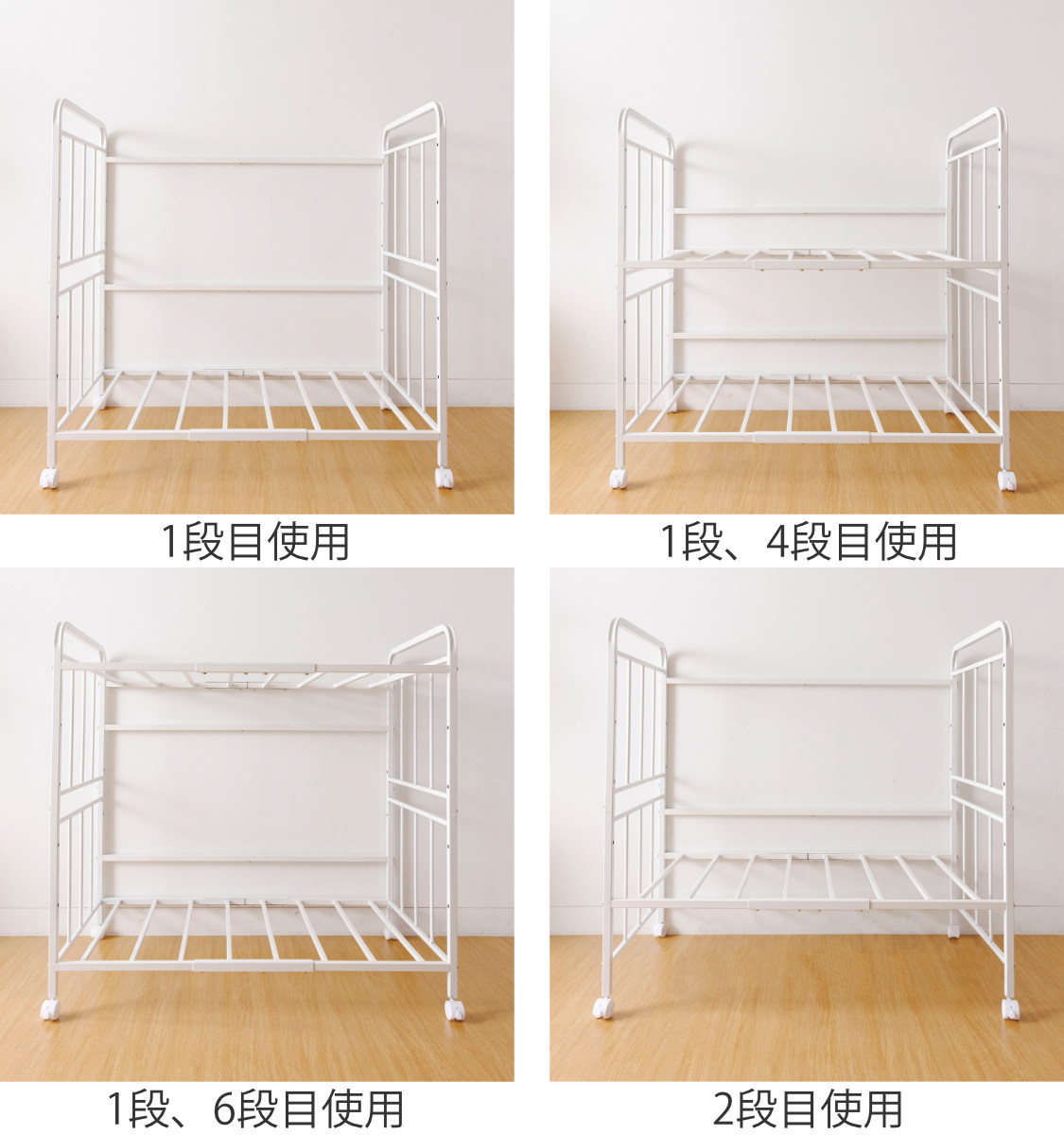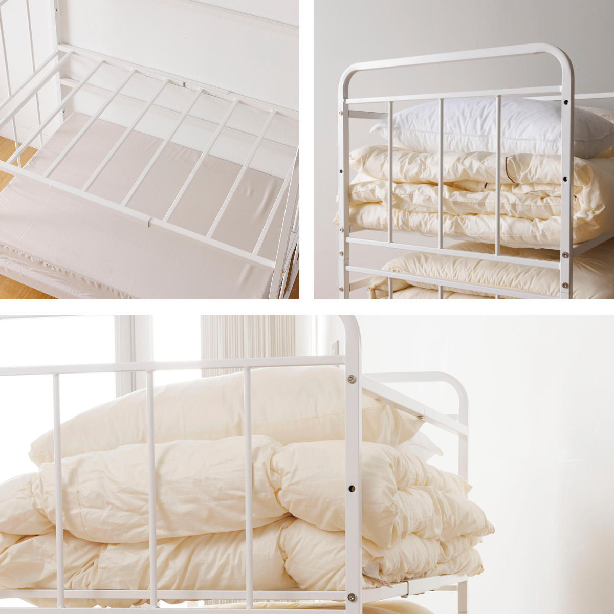 通気性を考えながら、布団が底棚や側面の隙間から布団が落ちにくいように設計されています。布団崩れを防止するバーは、移動時の落下を防ぎます。バーの位置は変更可能です。また全体は角パイプなので丈夫で耐久性にも優れています。