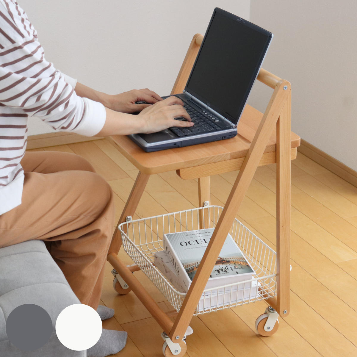 | 材質 | 天板:天然木(ビーチ)、ポリウレタン塗装 フレーム:天然木(ビーチ)塗装 カゴ:スチール、粉体塗装 |