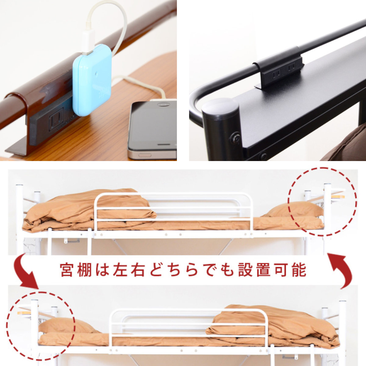 スマホやメガネをおくことができる便利な宮棚付きです。コンセント部分はにスライドできるので、お好みの位置でお使いいただけます。宮棚は、組み立て時に左右どちらにも設置することができます。