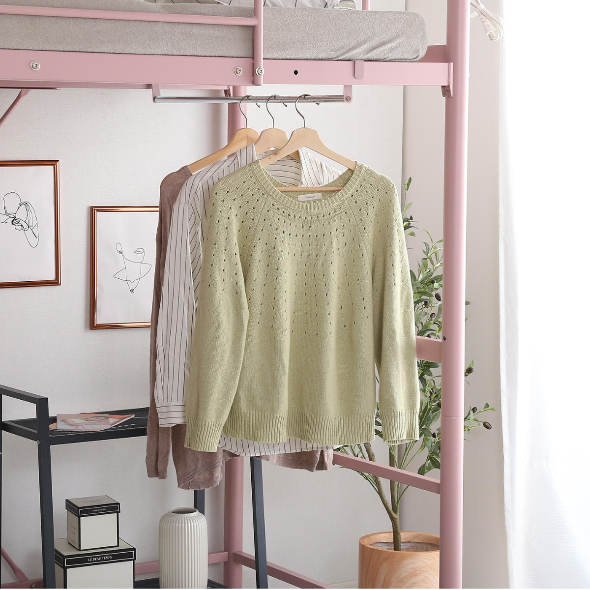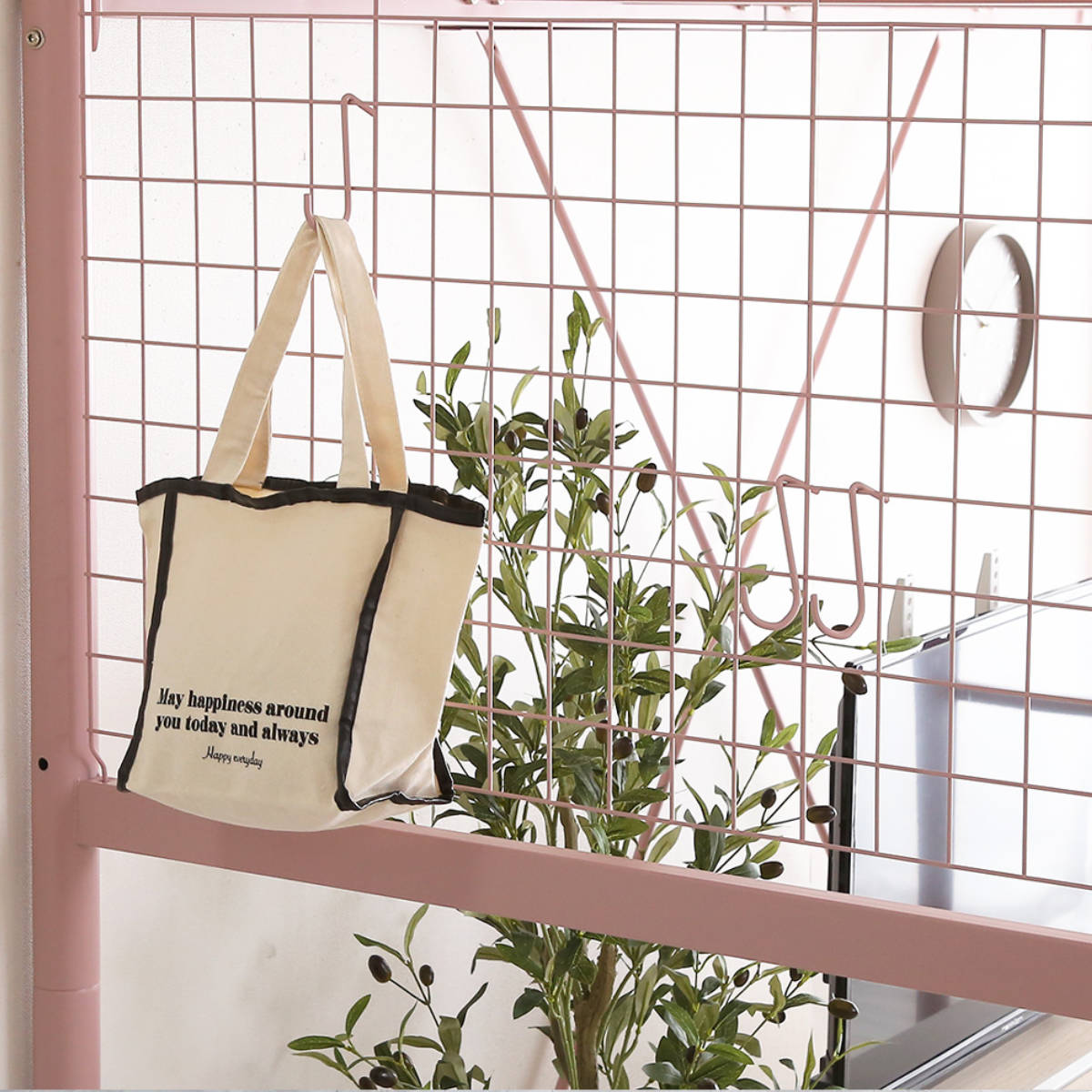 毎日使うカバンなどをかけることができ、使う時にサッと取れるので便利です。ワイヤーネットの位置は、お部屋のレイアウトに合わせて左右どちら側にも設置していただけます。