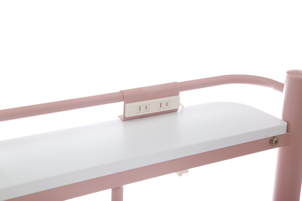 スマホやメガネをおくことができる便利な宮棚付きです。宮棚は左右どちらにも設置することができ、コンセント部分は左右にスライドできるので、お好みの位置でお使いいただけます。