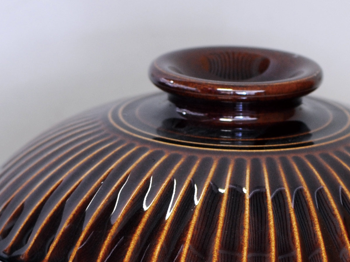 伝統色を使ったモダンなデザインフタには菊の花弁のようなデザインが施されています。水あめのような艶感のある深い飴色のブラウン(飴釉)と、透明感のある美しいブルー(瑠璃釉)の2色展開。本体の黒色がモダンな雰囲気で、和洋どちらの食卓にも使いやすいデザインです。