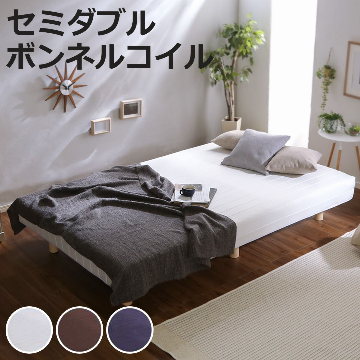 ボンネルコイル セミダブル継ぎ目のない、一体型の脚付きマットレスです。フラットな寝心地で、しっかり身体を受け止めます。一人でゆったり使いたい方や、体格の良い方におすすめのセミダブルサイズです。フレームがないシンプルな構造なので、場所を取らずに設置できます。