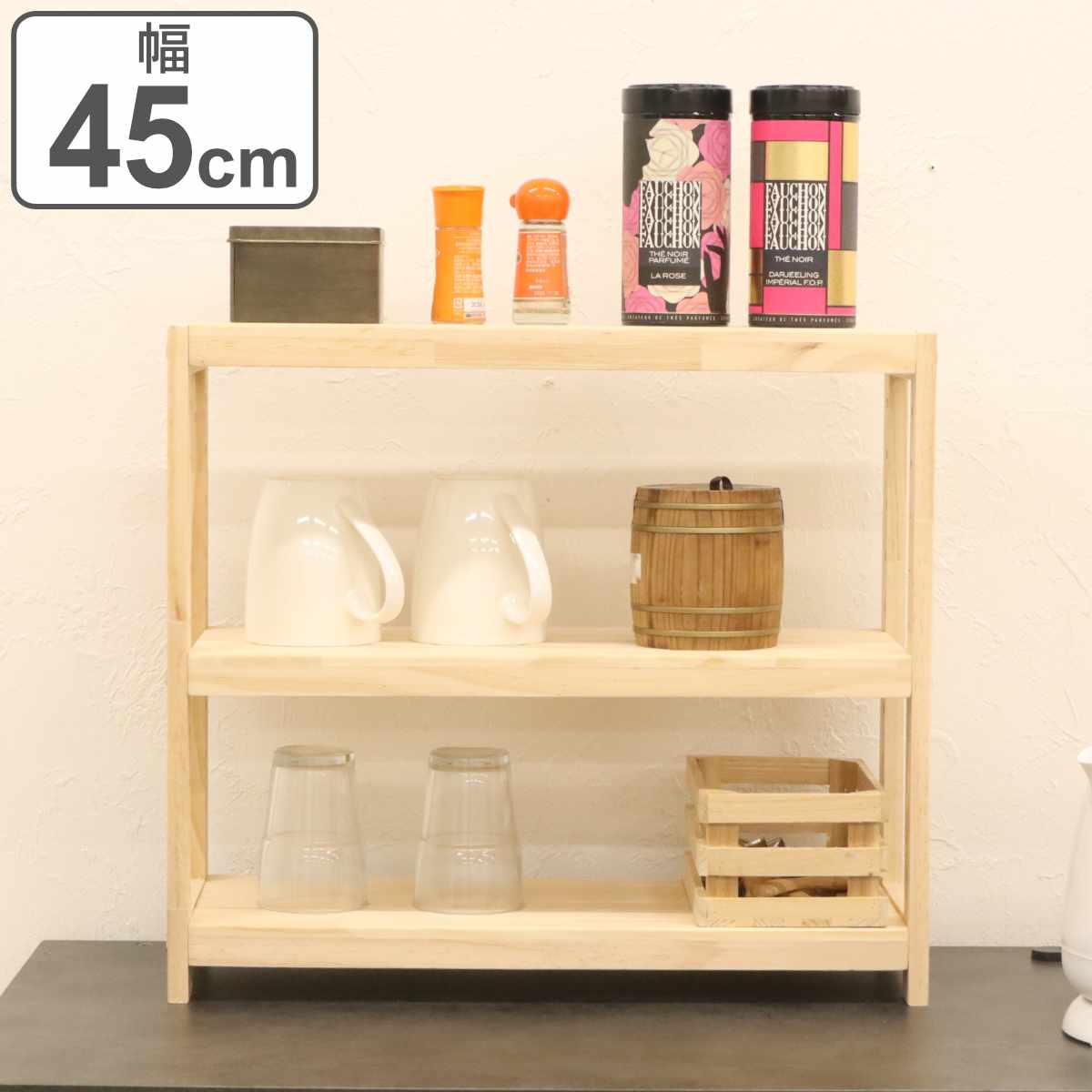 ナチュラルでお部屋に馴染むパインラック 幅45cmパイン材を使用したナチュラルな収納ラックです。お部屋に馴染みやすいシンプルなデザインです。小柄なラックなのでディスプレイラックとしてデスク上、棚の上に置いたり、キッチンでカップボードの上に置いて調味料などを並べたりと様々な使い方ができます。