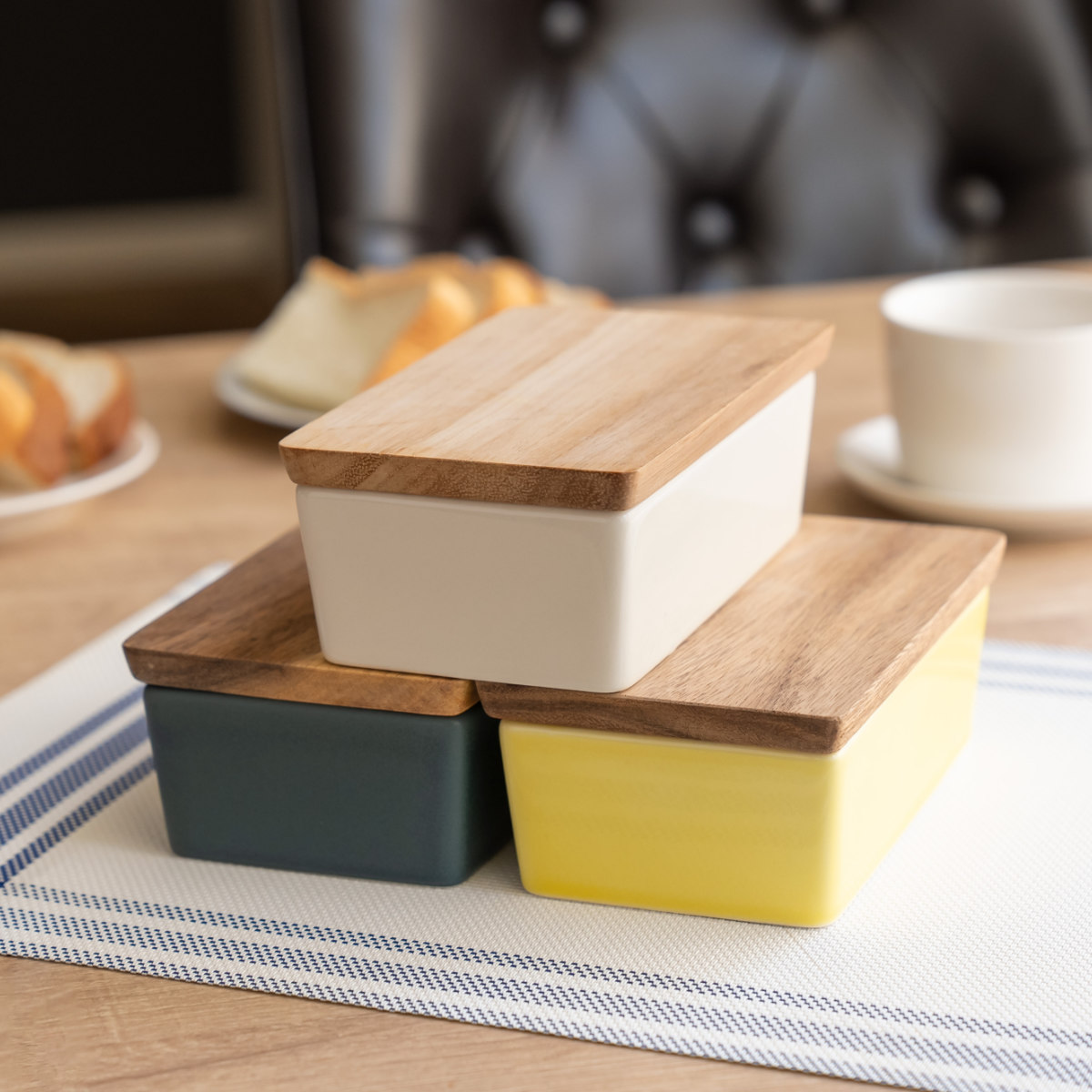 器の部分は洗いやすい半磁器製、蓋はアカシア材を使用しています。市販のバター200gがちょうどよく収まり、そのまま冷蔵庫へ入れれて便利です。ナチュラルな雰囲気のホワイト、アクセントカラーにもなるイエローとブルーの3色です。