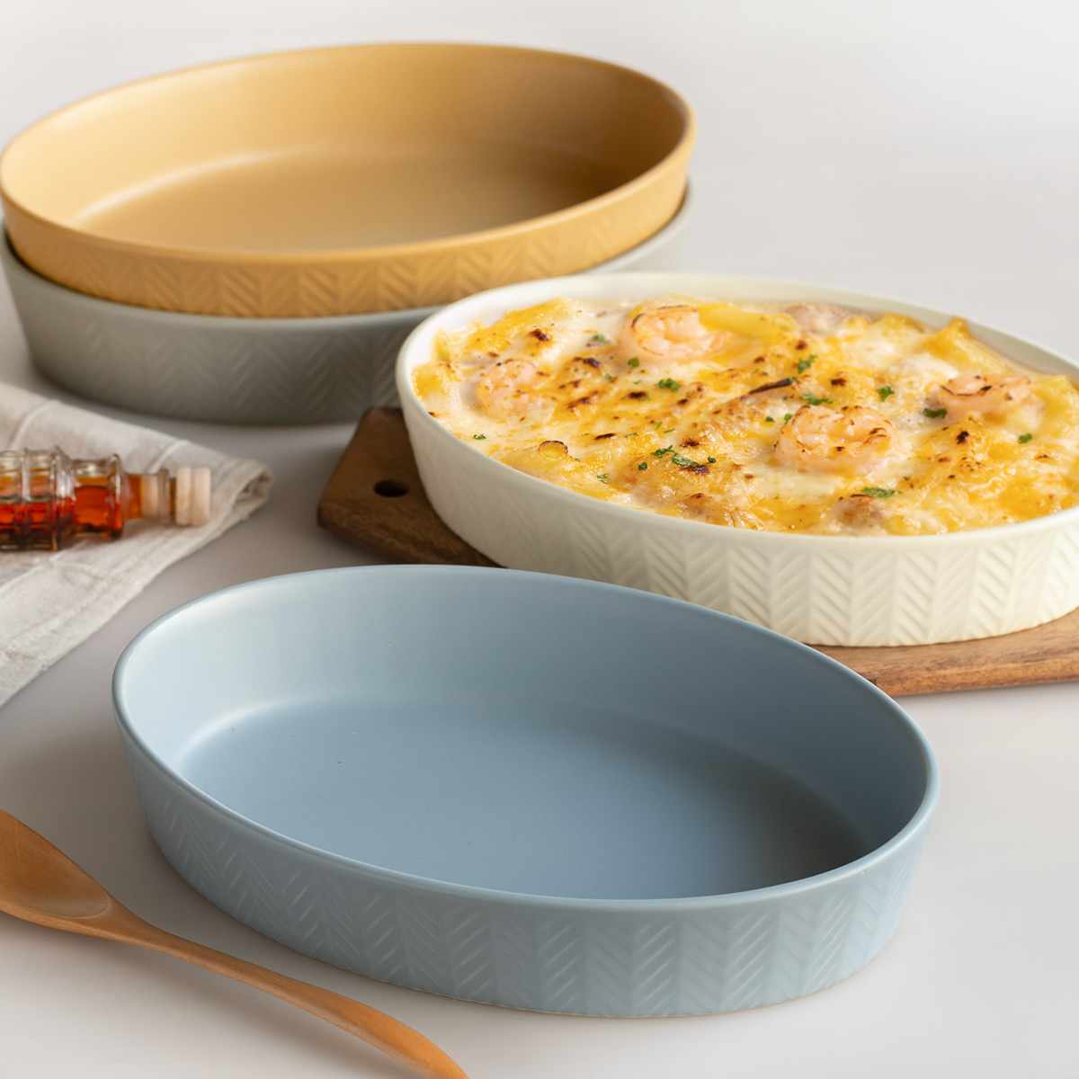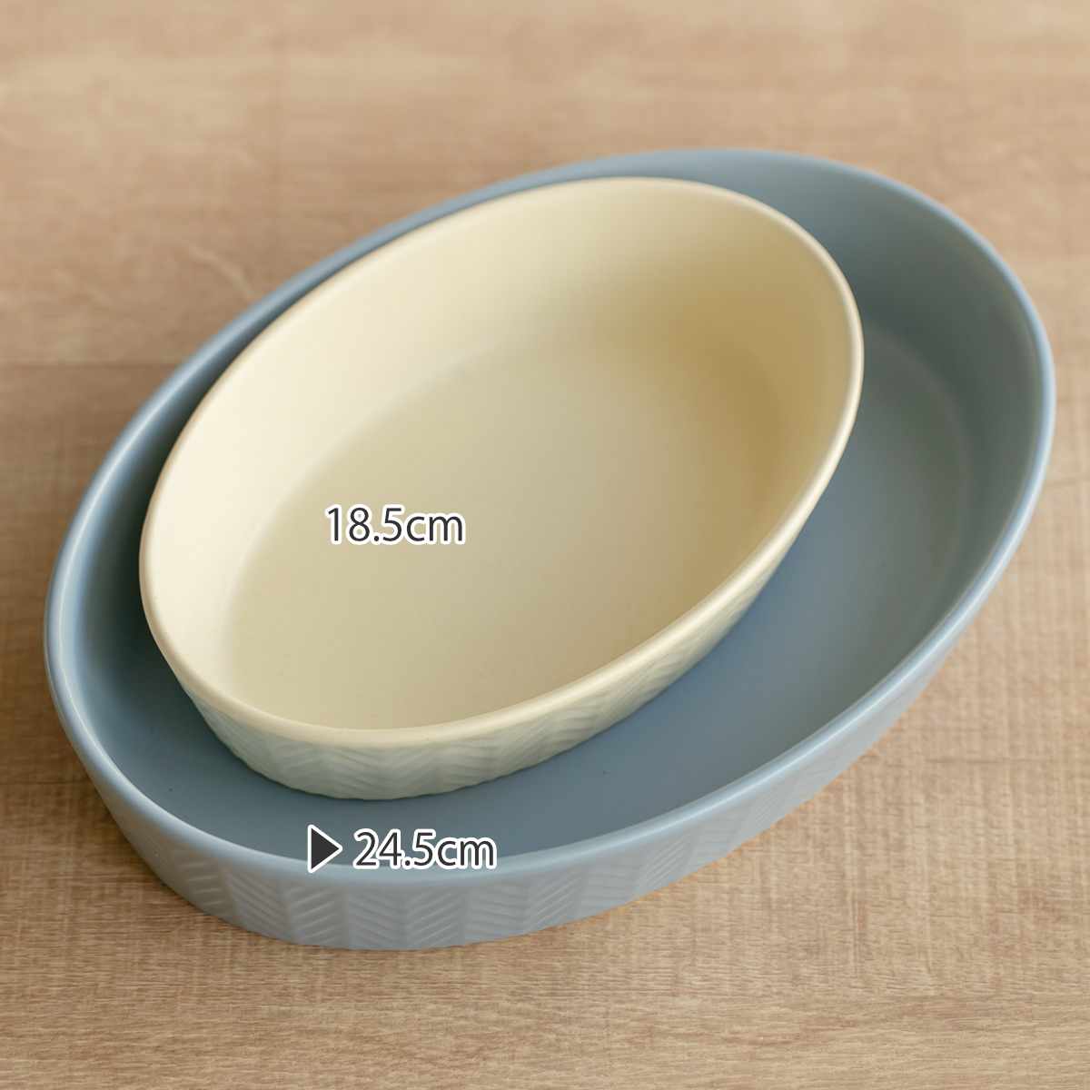 グラタン皿を数枚重ねても、程良く安定します。食器棚でかさばりがちなお皿もすっきりと収納することができ、食器棚の中でも場所を取りません。