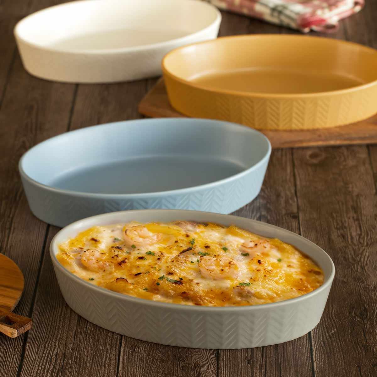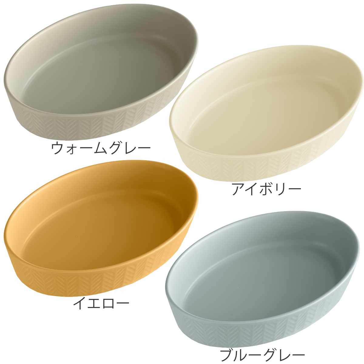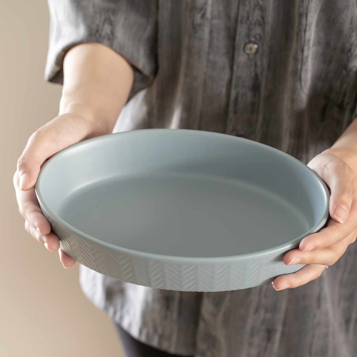 さりげないヘリンボーン柄が美しいグラタン皿です。お料理が引き立つシンプルなデザインと、ベーシックな色味でどんな食卓にも馴染みやすいです。気取り過ぎない素朴なテイストが、ほっこりとした雰囲気の空間を演出します。