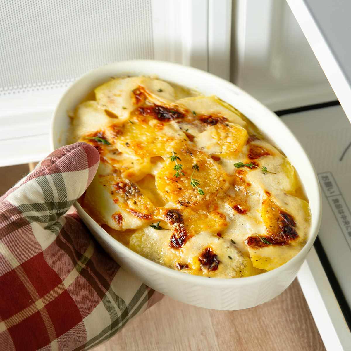 グラタン、ドリアなどのオーブン料理を、オーブンから出してそのままテーブルに出せます。フレンチトーストやブラウニーなどのお菓子作りにも便利です。忙しい朝も、チーズや残り物のおかずを入れてオーブンで加熱すれば時短になり、朝食にもおすすめです。