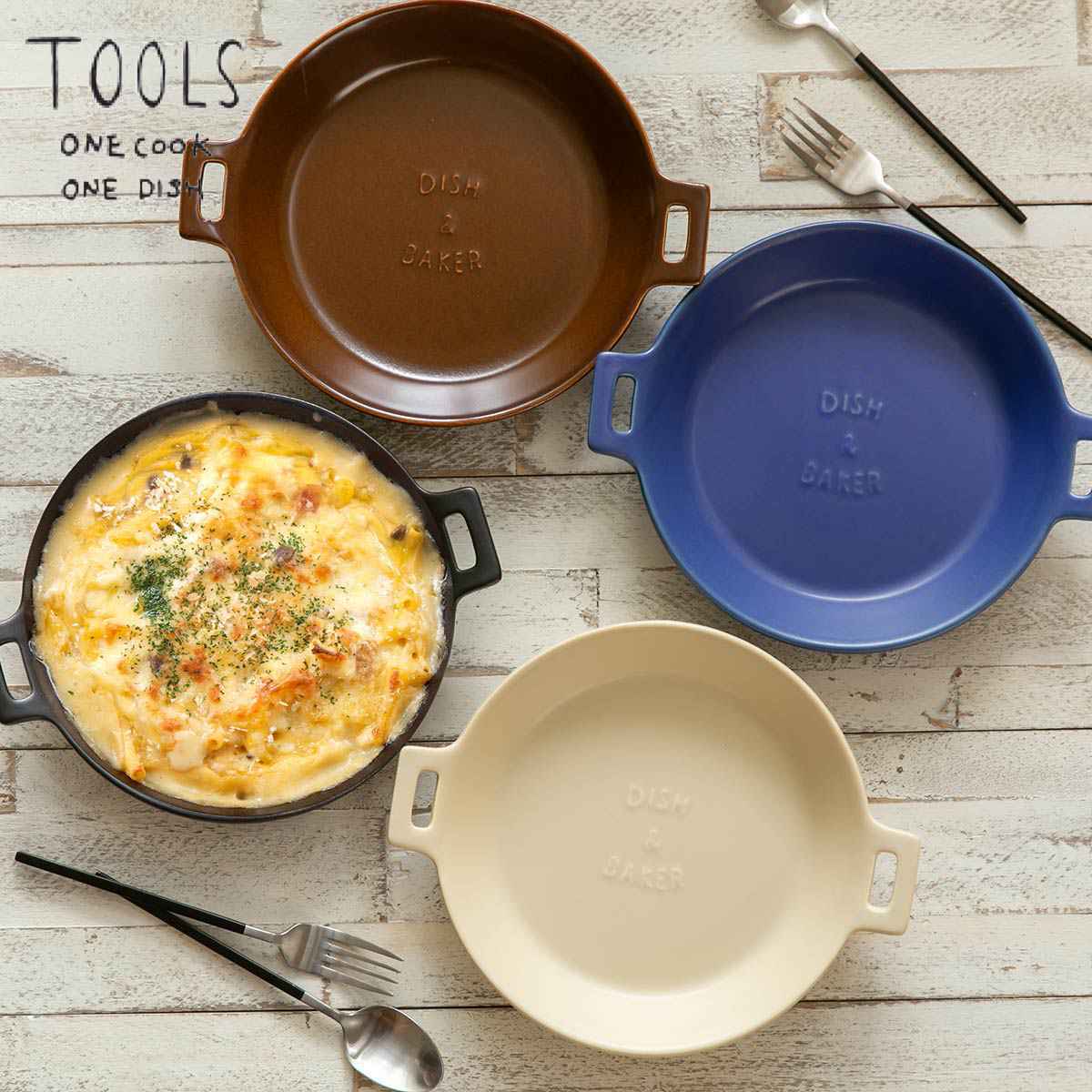 下ごしらえから食卓までこれ1つ デッシュ&ベイカー L忙しい毎日に嬉しい、下ごしらえから食卓まで1つで完結する耐熱陶器製のプレートです。具材を並べてオーブンやグリルに入れるだけで手軽にアヒージョやパン粉焼きが完成。栄養満点で素敵な夕飯が愉しめます。1人分のおかずにちょうどいいサイズ感です。