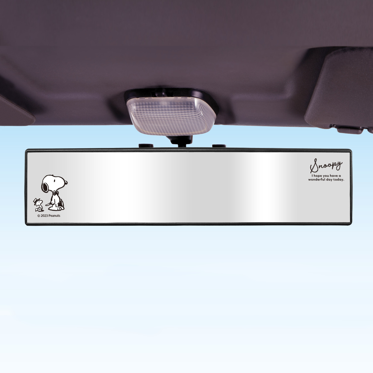 スヌーピーのプリントがオシャレなルームミラー●既存のルームミラーに被せるだけなので、気軽にイメージチェンジできます。