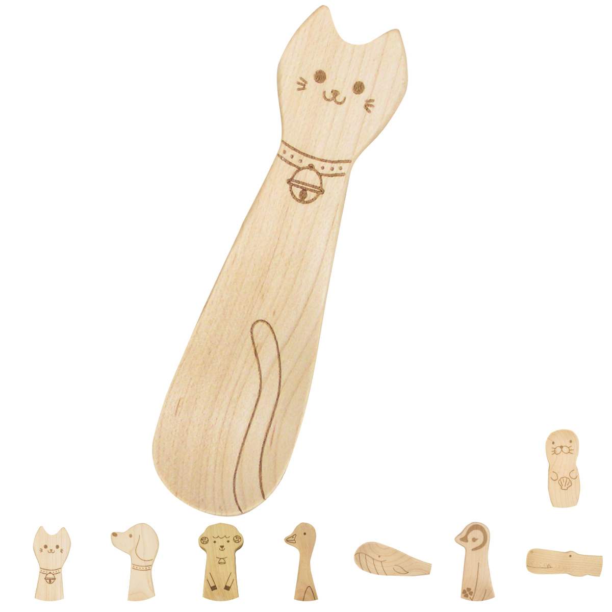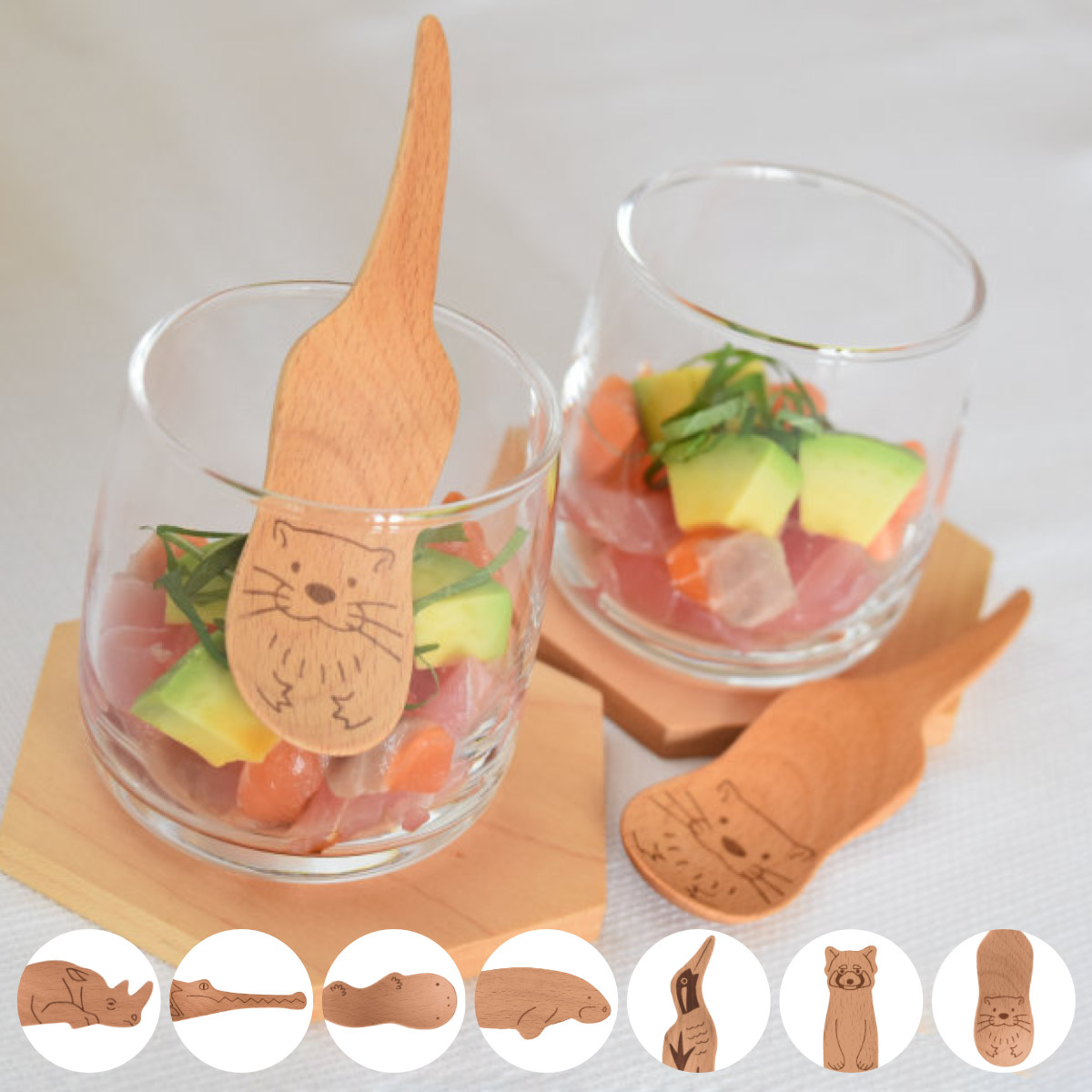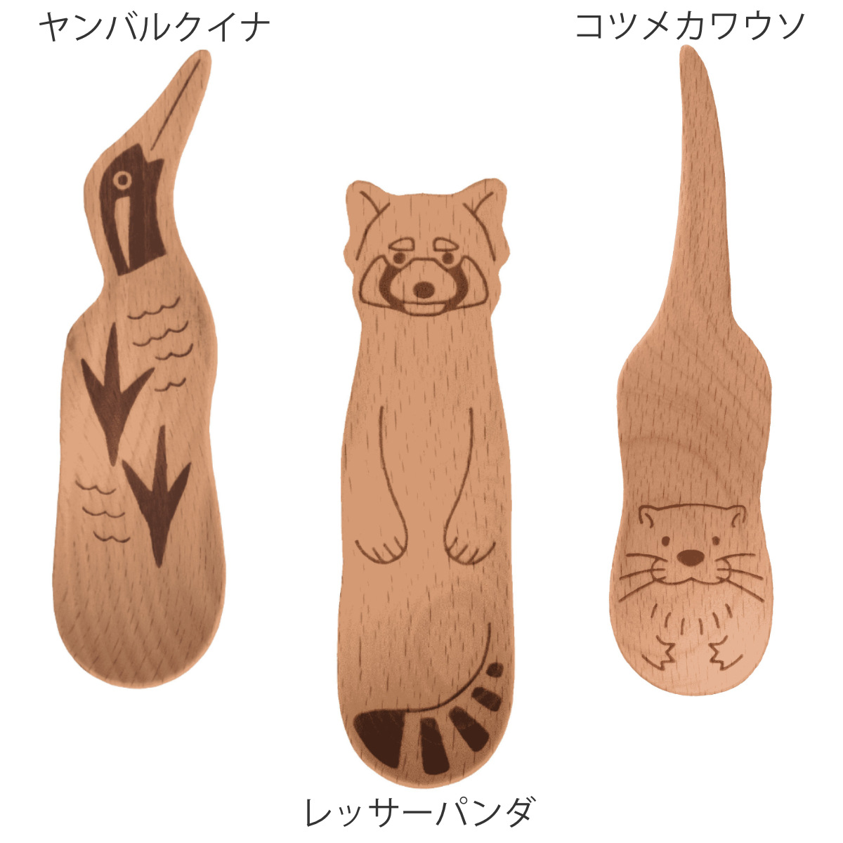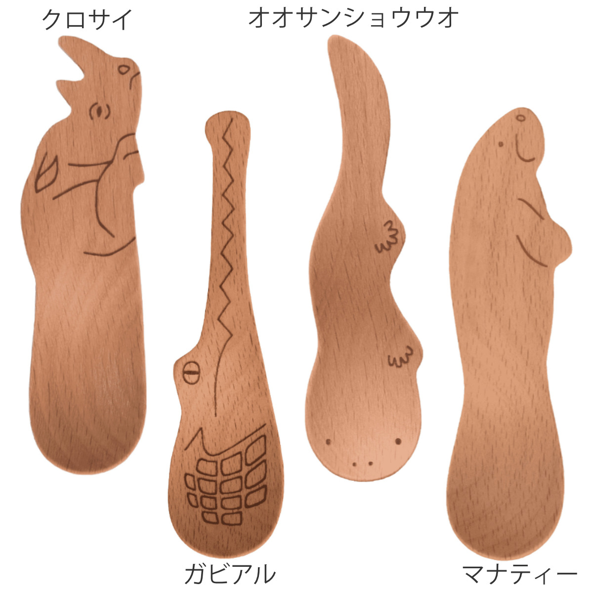 絶滅危惧種の動物スプーン絶滅危惧種の動物に注目したデザインのスプーンです。木製食器製造の長年の技術の経験を活かし、それぞれの動物ならではの様子をカタチにしながらも、食事やデザートで使いやすい形状に仕上げています。