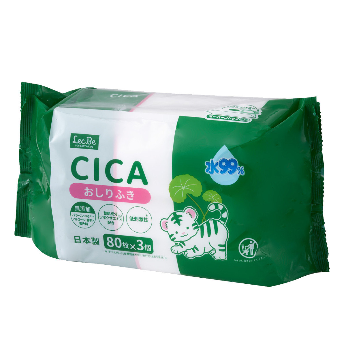 美容成分CICA配合の赤ちゃん用おしりふき 80枚入り3個セット美容成分CICA配合の赤ちゃん用おしりふき、80枚入り3個セットです。肌の再生や修復を助けるとされる効果を持つ、ツボ草由来の整肌成分CICAが配合されています。乾燥しやすい赤ちゃんの肌の水分を保持しながら、やさしくふきとることができます。安心の日本製です。