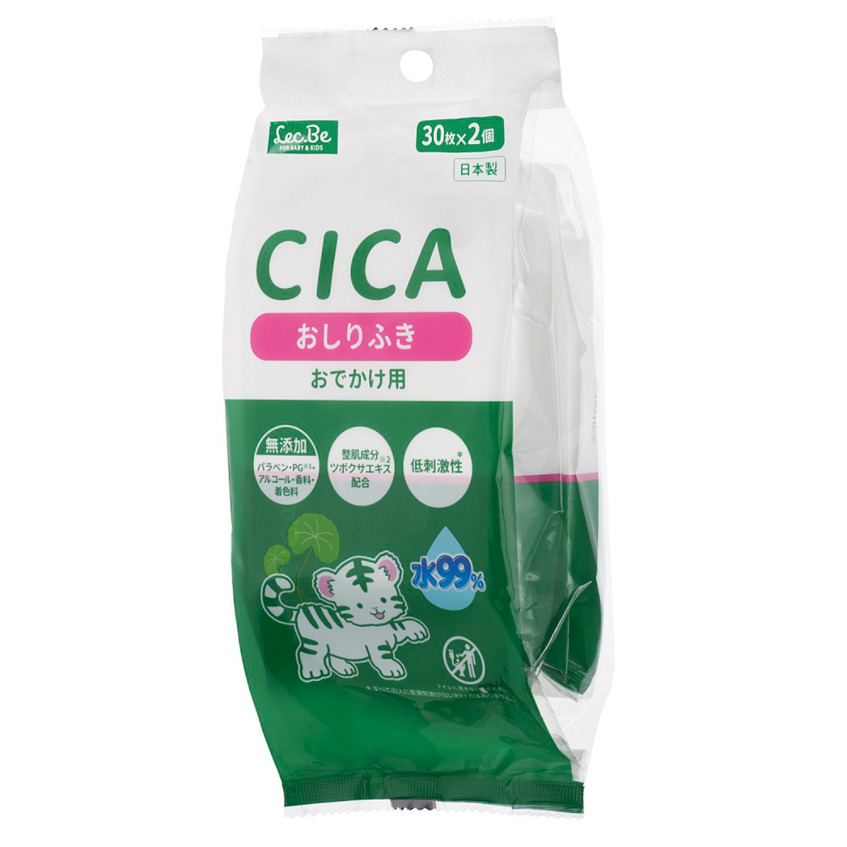 美容成分CICA配合の赤ちゃん用おしりふき 30枚入り2個セット美容成分CICA配合の赤ちゃん用おしりふき、30枚入り2個セットです。お出かけに便利な携帯タイプです。肌の再生や修復を助けるとされる効果を持つ、ツボ草由来の整肌成分CICAが配合されています。乾燥しやすい赤ちゃんの肌の水分を保持しながら、やさしくふきとることができます。安心の日本製です。