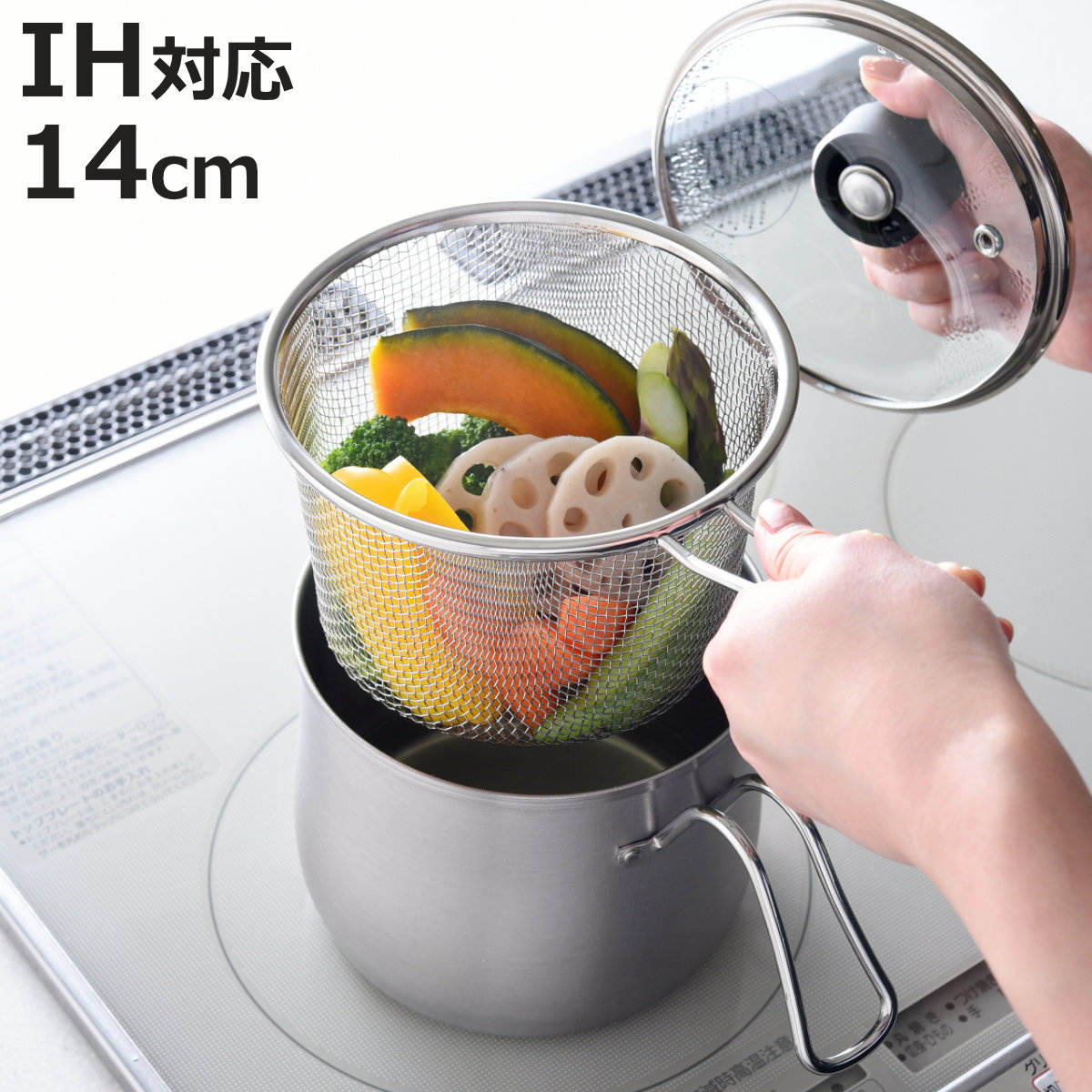 | サイズ | 外寸:約 幅15×奥行23.5×高さ17.5(cm) 内寸:約 高さ12.5(cm) 内径:約 14(cm) 鍋:幅 約23.5x奥行15x高さ12.5(cm)、内径14cm、深さ12.5cm、底厚0.7mm ストレーナー:幅 約22.5×奥行15×高さ12.5(cm) ガラス蓋:約 直径15×高さ5.5(cm) |