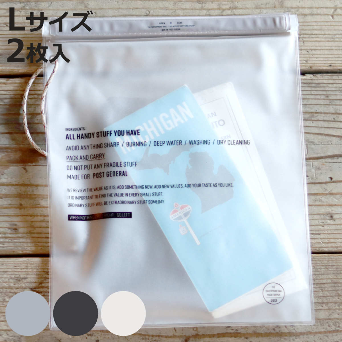 様々なシーンで活躍する防水バッグLサイズ暮らし・旅・遊びのガジェットアイテムとしてあると便利な防水バッグ、Lサイズ2枚入りです。その名の通り、濡らしたくない携帯小物類を水気から守る収納バッグですが、日々の暮らしや、旅先、外遊びなどさまざまなライフシーンで使える小物収納として提案します。