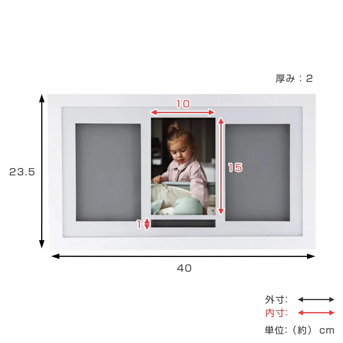 | サイズ | フレームサイズ:約 幅40×奥行2×高さ23.5(cm) 写真サイズ:約 幅10×高さ15(cm) |